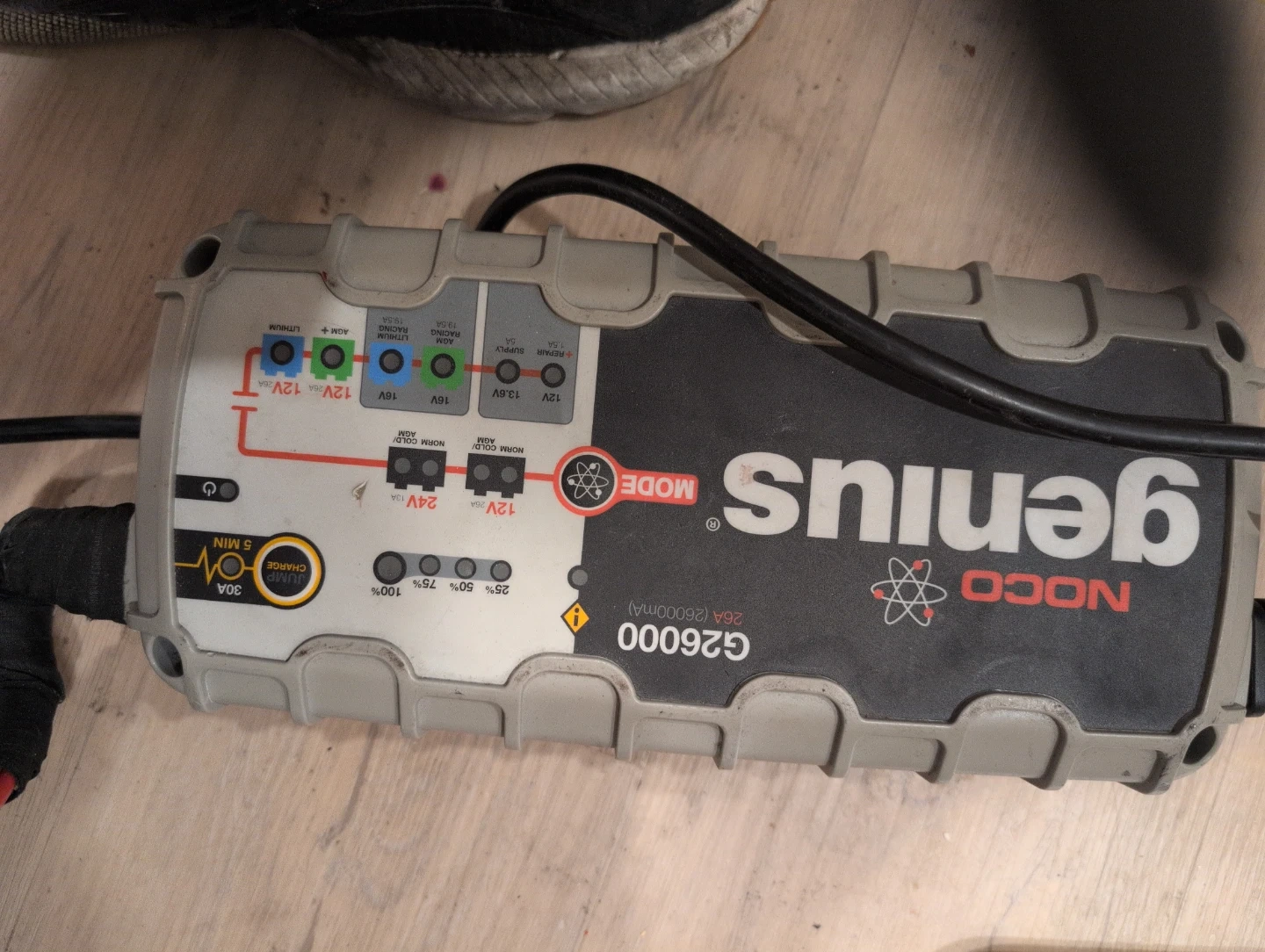 This is a NOCO Genius G26000 26A battery charger. It's designed for 6V and 12V batteries. It has multiple charging modes and a 5-minute quick charge function.