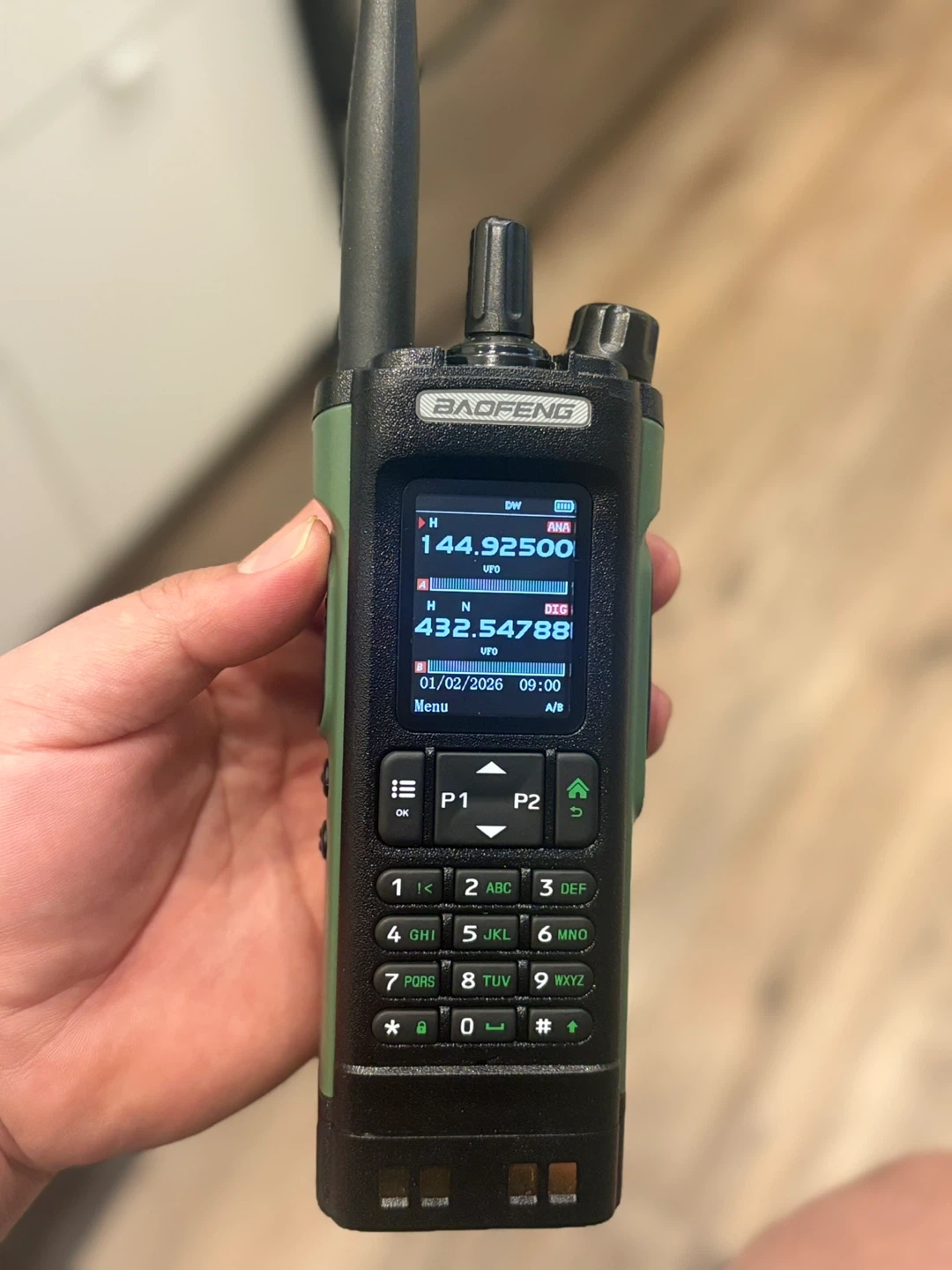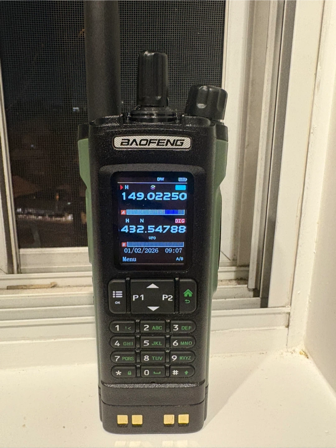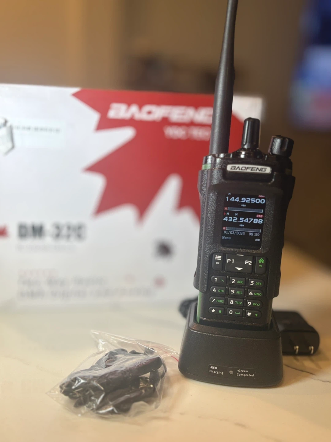 This is a Baofeng DM-1702 DMR digital two-way radio. It supports digital and analog modes. The display shows frequencies and time. It comes with a charging dock and accessories.