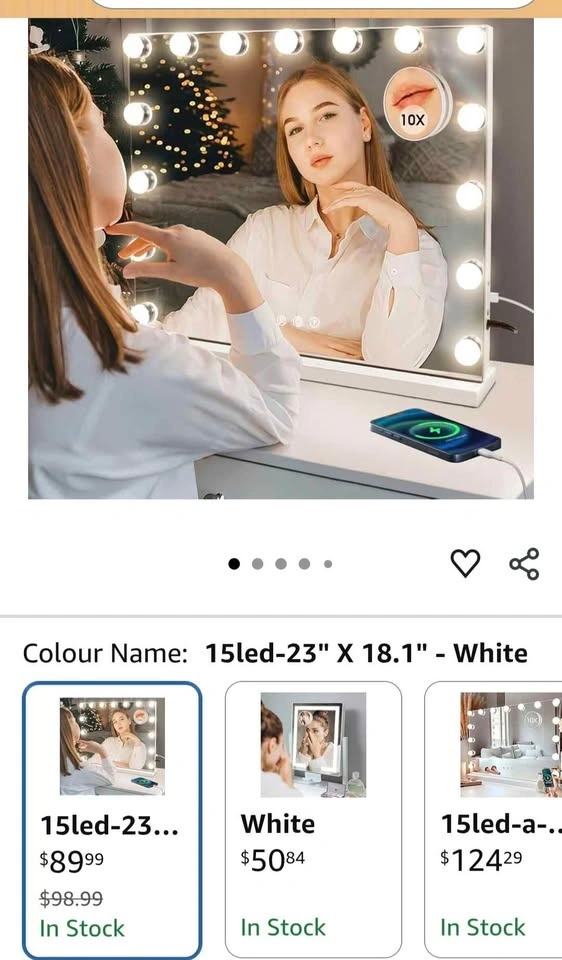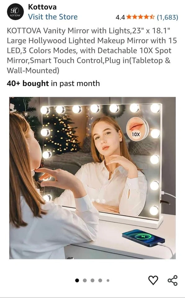 Upgraded vanity mirror with 15 LED bulbs and three adjustable light colors (3500-7000K) to protect your eyes during makeup application. Lifespan exceeds 50,000 hours. The illuminated hollywood mirror is controlled by dimmable sensitive smart touch buttons. The "M" button changes light mode, the middle button turns it on and off, and the "P" button adjusts brightness. A USB charging port is designed on the side for convenience. It has two magnification options: 1X for a full-face view, and a 3.5-inch detachable 10X zoom mirror for precise makeup application. The mirror can be used on a desk or mounted on the wall, and includes hardware.
