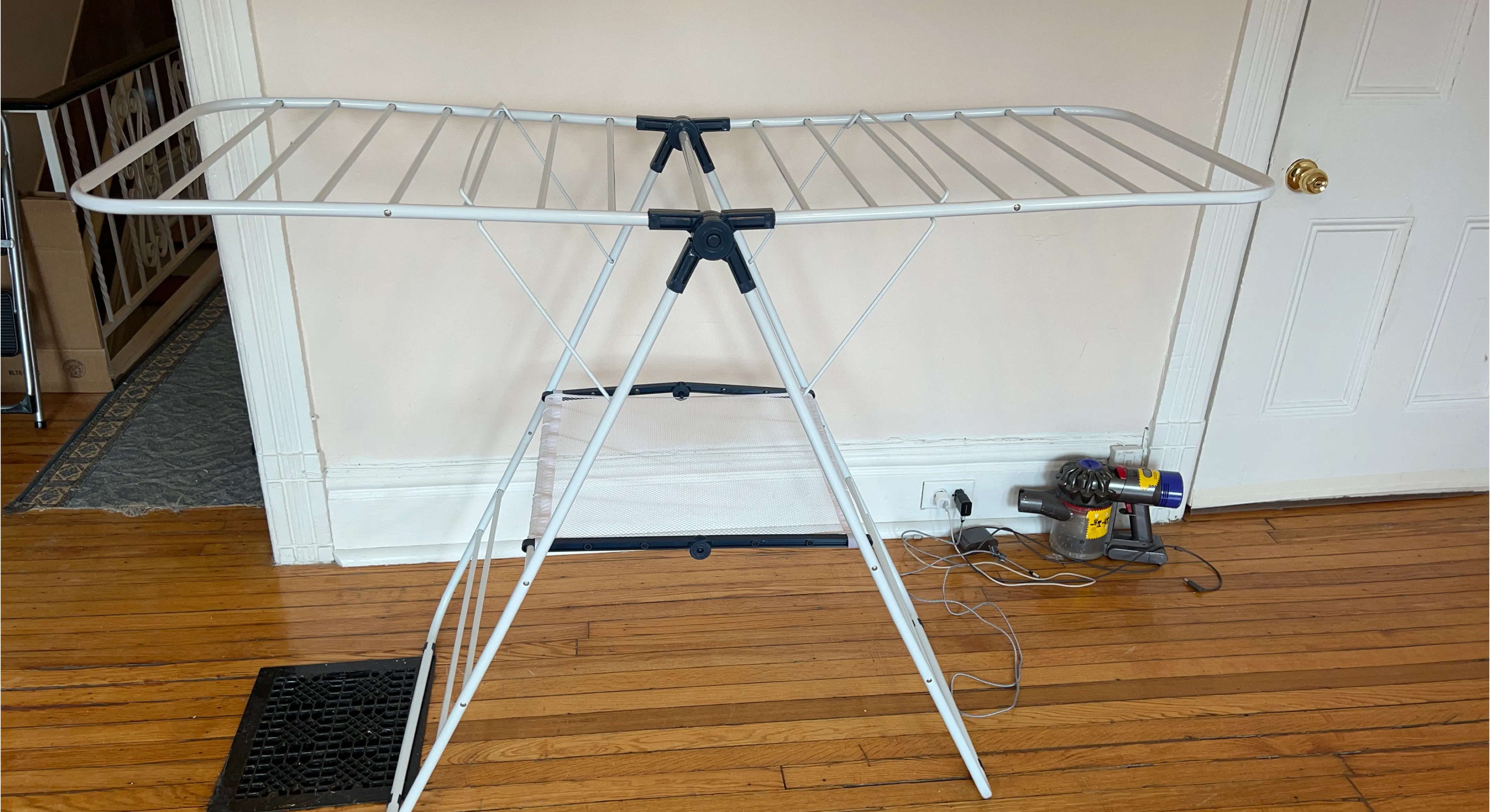 This is a white, collapsible laundry drying rack. It's made of metal with black plastic joints. It folds flat for easy storage. This rack is useful for air-drying clothes indoors or on a balcony.