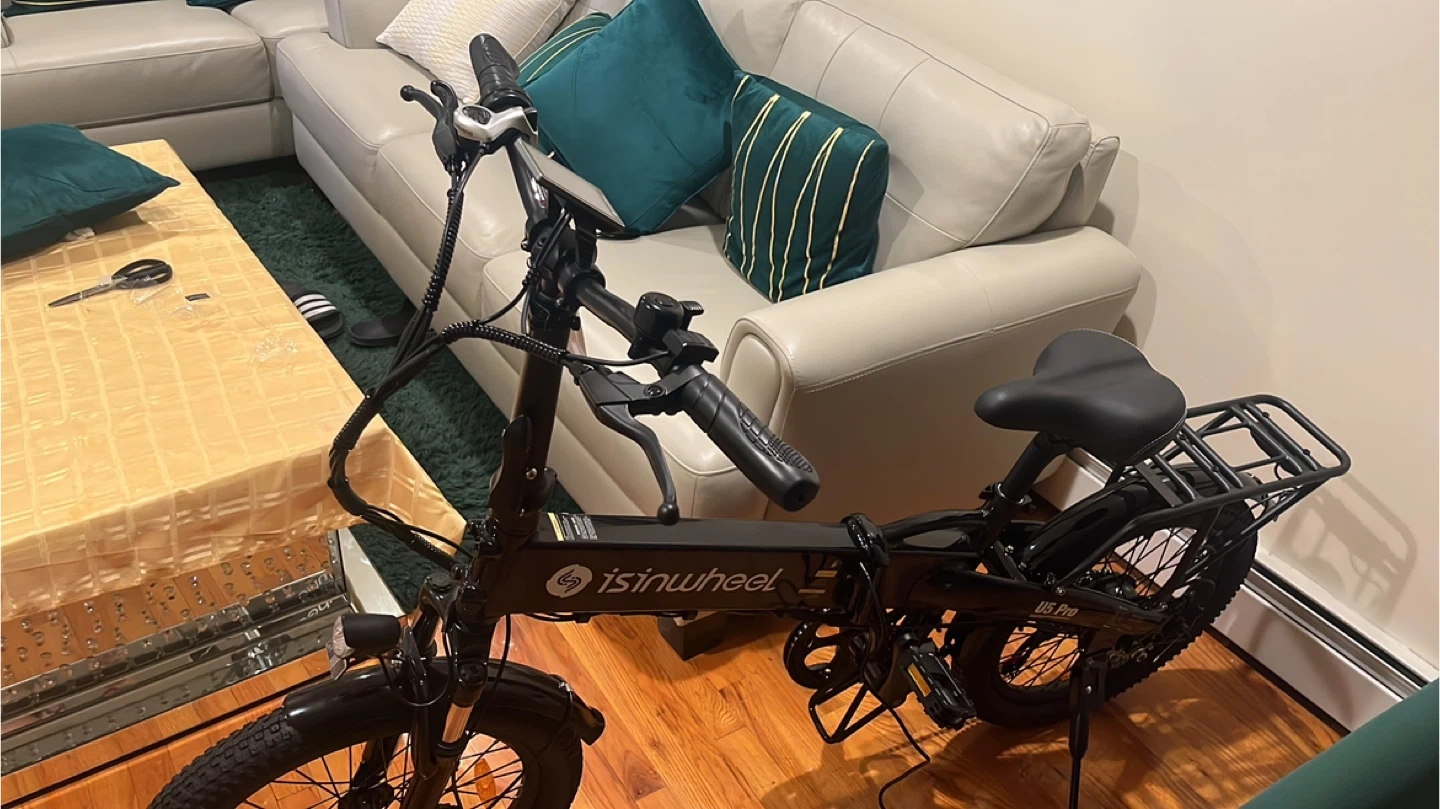 This is a black Sisinwheel US Pro electric folding bike. It features a foldable frame for easy storage and transport. The bike has a rear rack for carrying items. It's designed for convenient commuting and recreational rides.