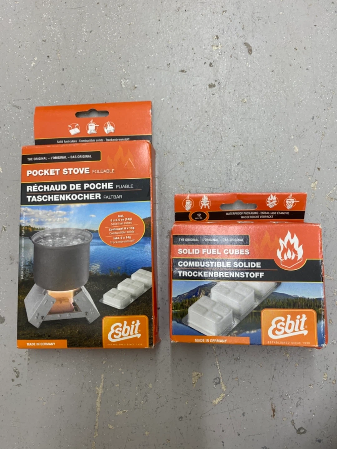 80Selling a brand new Esbit Pocket Stove foldable and Esbit Solid Fuel Cubes. Both are in their original packaging and have never been used. Perfect for camping or emergency preparedness!