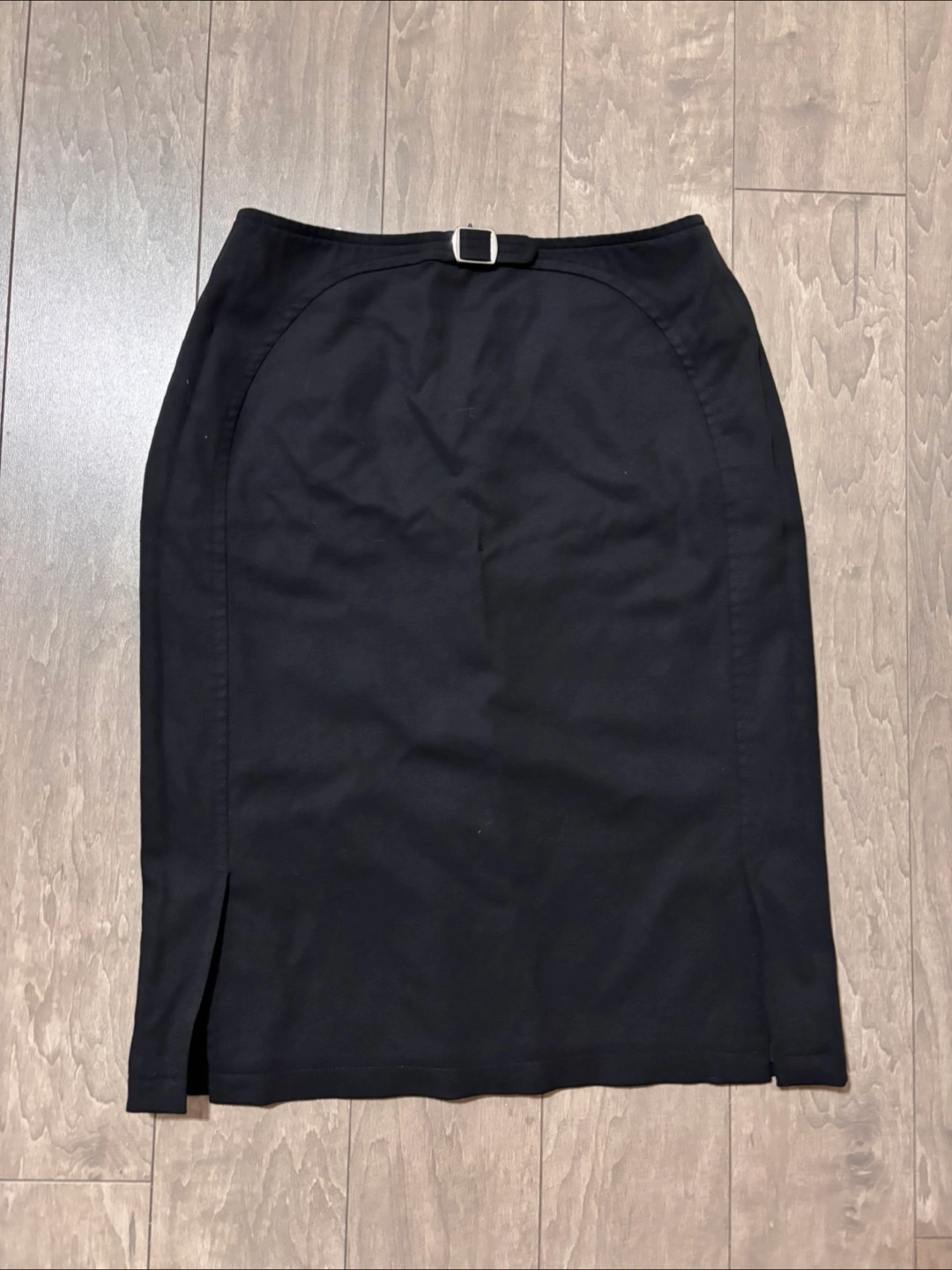 Used Escada skirt in black. It's a size 36. The material is a blend of wool and elastane, offering a comfortable and flattering fit. It has a small defect as pictured.