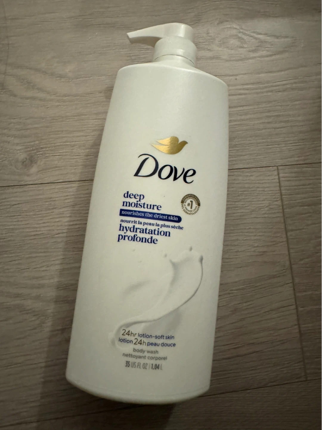 This is a large bottle of Dove Deep Moisture body wash. It's designed to nourish the driest skin and provide 24hr lotion-soft skin. The bottle contains 35 US FL OZ or 1.04 L of body wash.