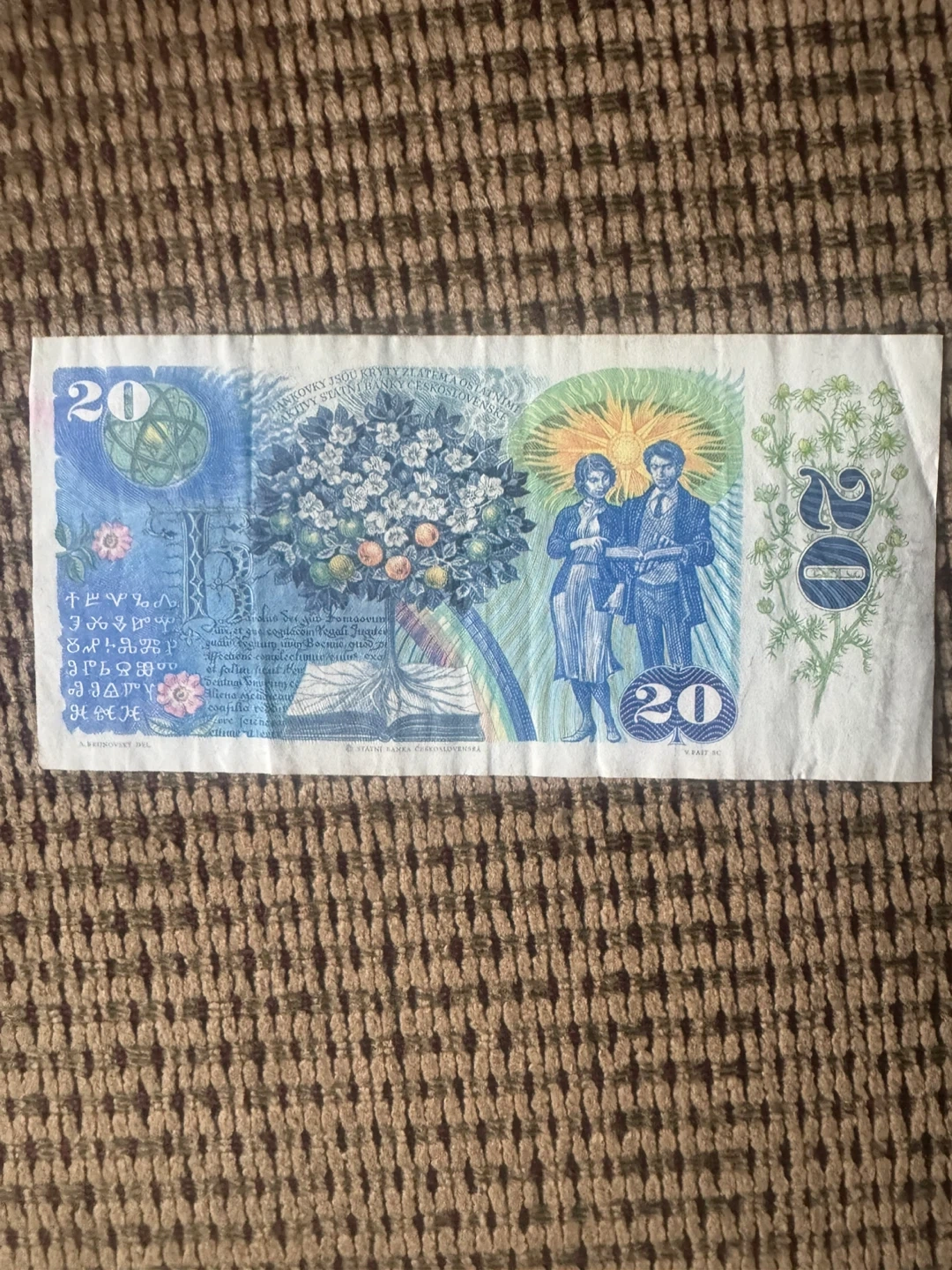 Selling a vintage Czechoslovakian 20 Korun banknote. It features intricate designs and historical figures. A unique collectible item!