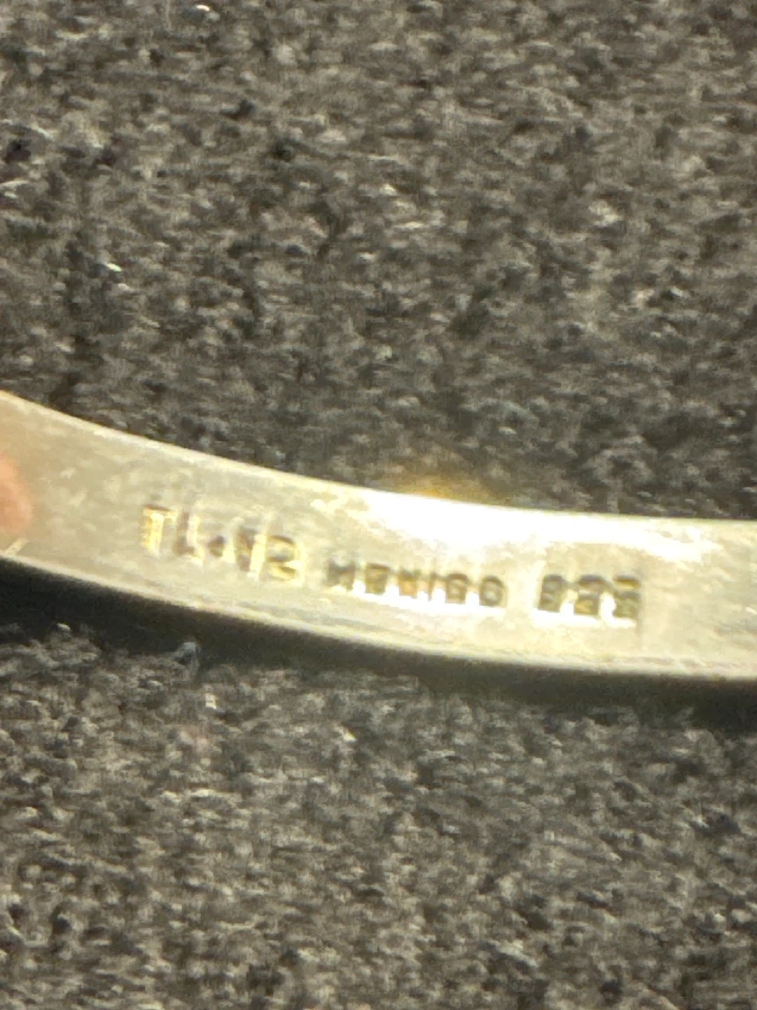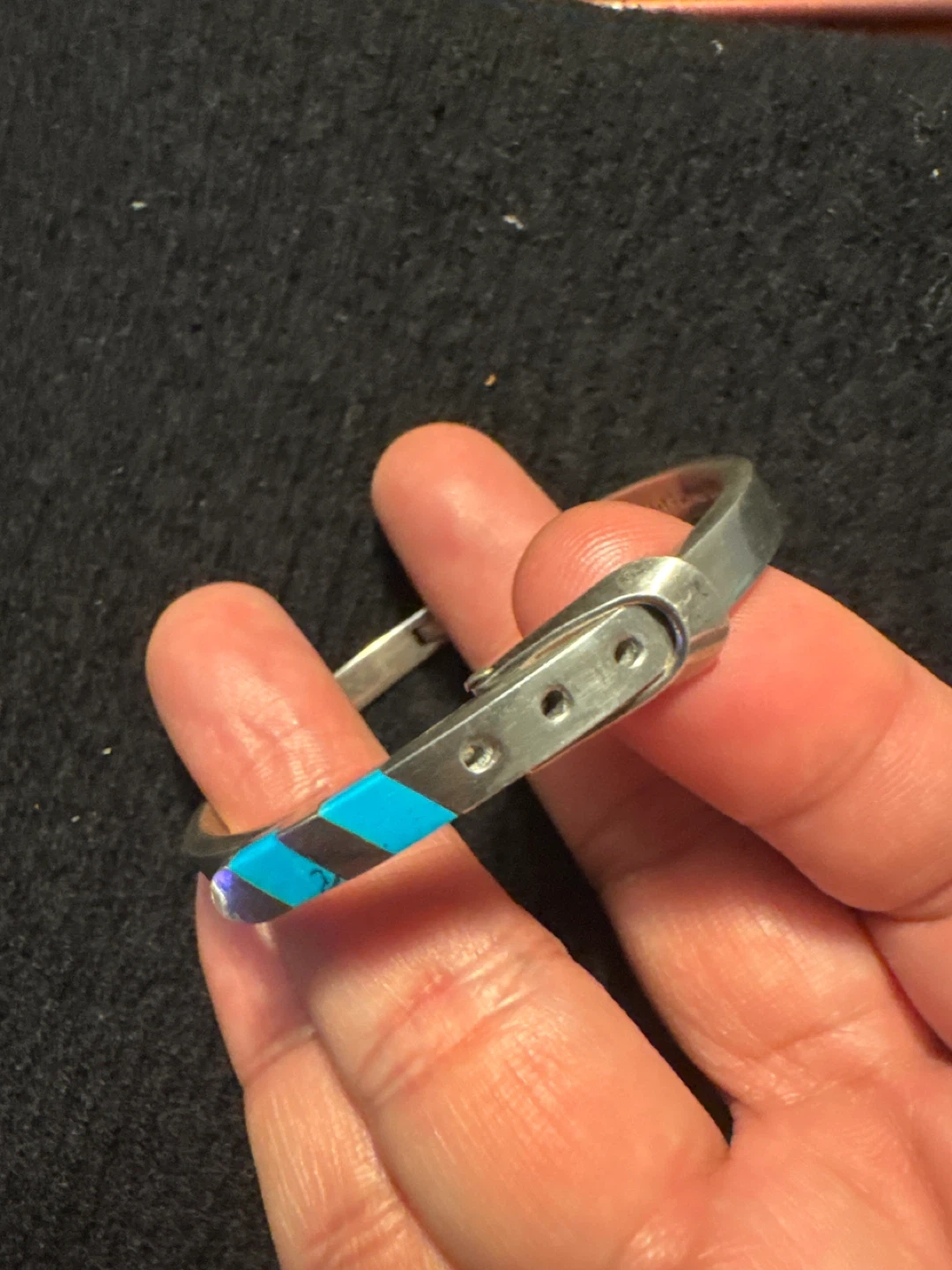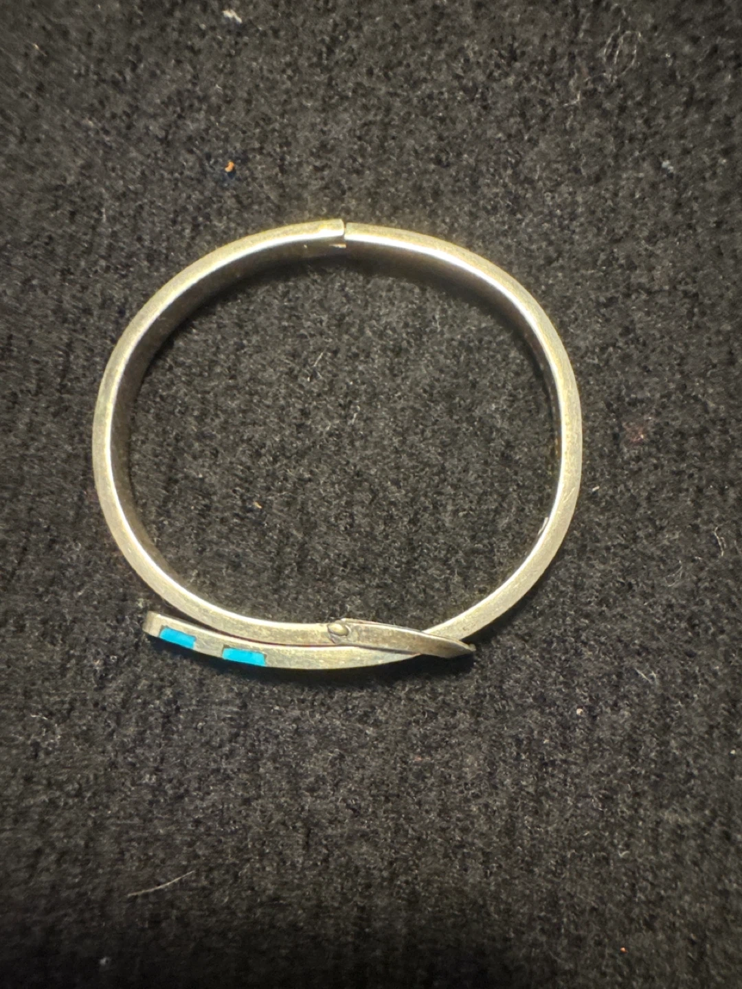 Sterling silver hinged bangle bracelet with turquoise inlay. "TLM12 MEXICO 925" stamped on the band. It's a unique accessory with a stylish design. This bracelet would add a pop of colour to any outfit!