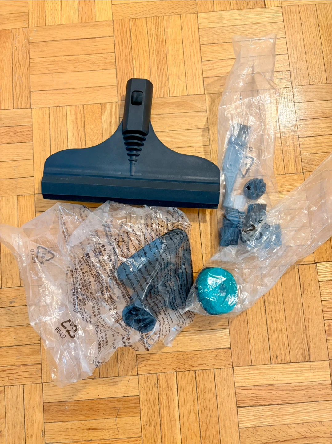 Storage compartment for 10 included accessories; 15.7 feet power cord; caster wheels