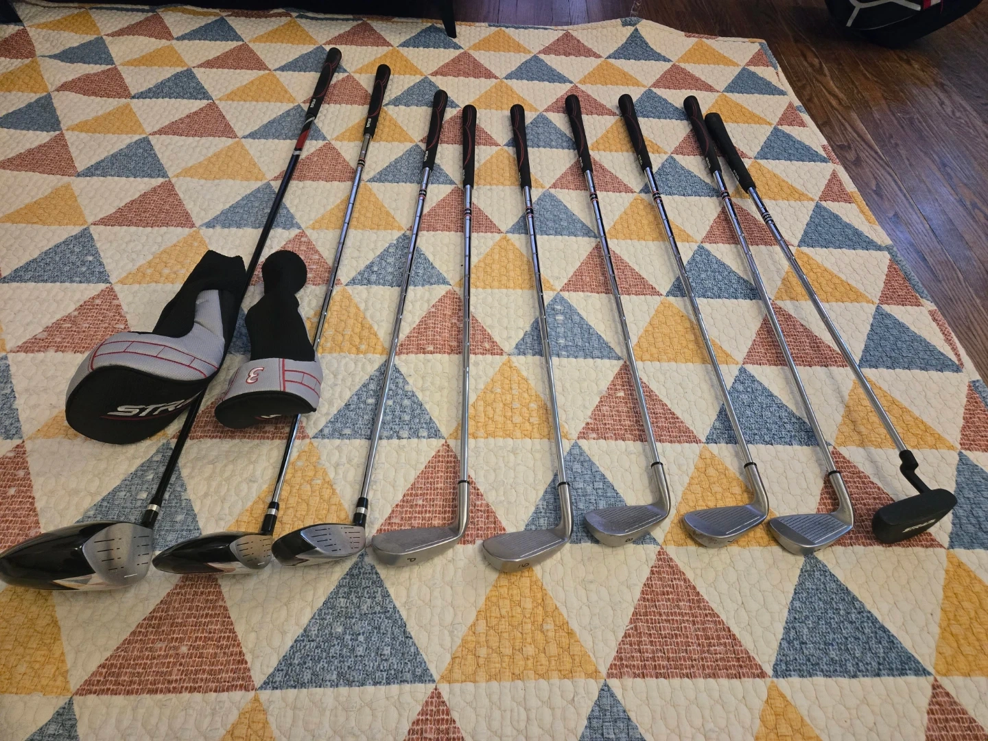 Full set of Strata golf clubs including a stand bag. Includes driver, fairway woods, hybrids, irons (6-PW), and a putter. Some club heads have "Titanium Composite" branding.