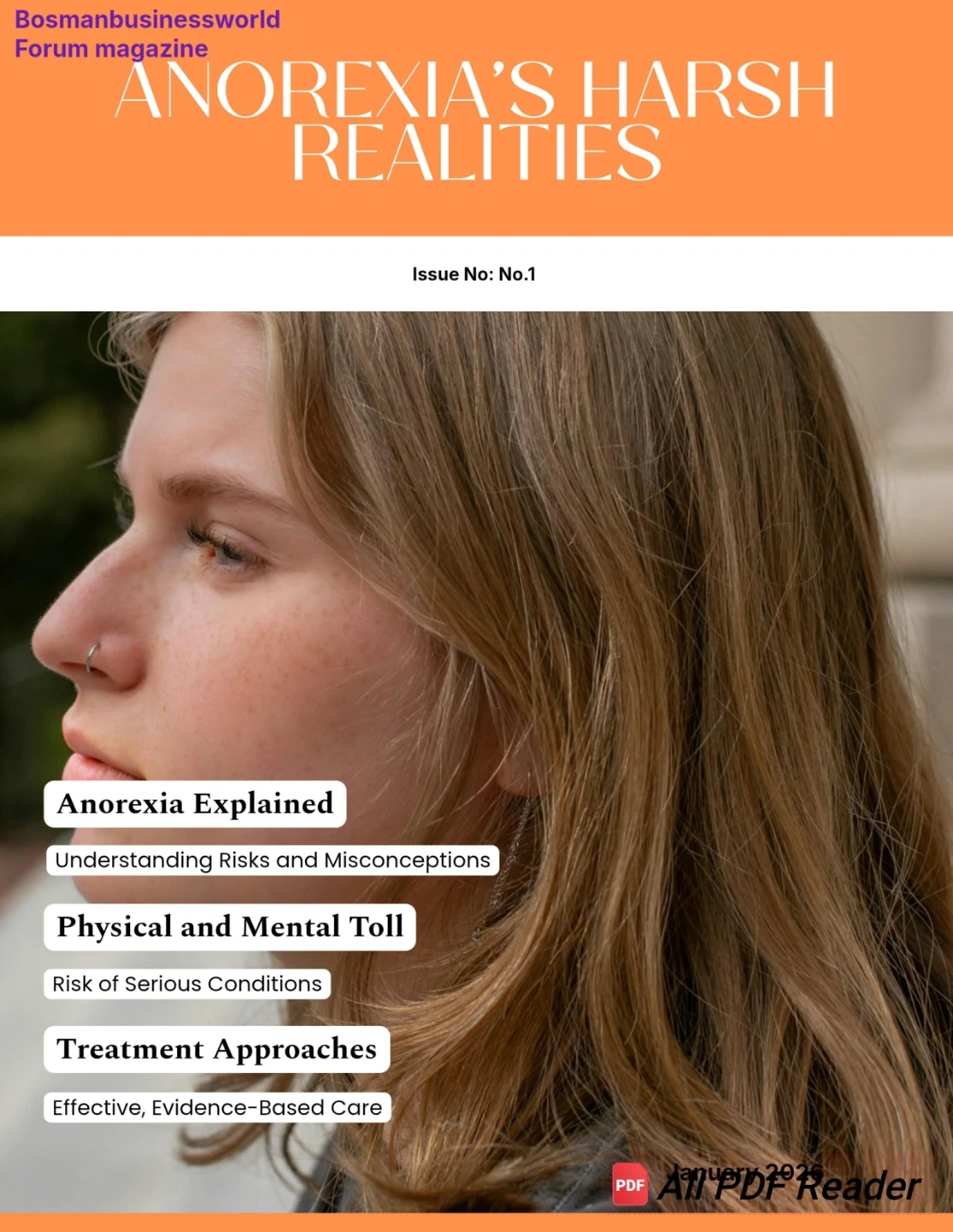 Anorexia's Harsh Realities forum magazine, issue number one. It explains anorexia, discusses risks and misconceptions, and covers physical and mental tolls. Treatment approaches and effective, evidence-based care are also detailed. This magazine provides comprehensive information on serious conditions. It is available for sell via email or WhatsApp sending.