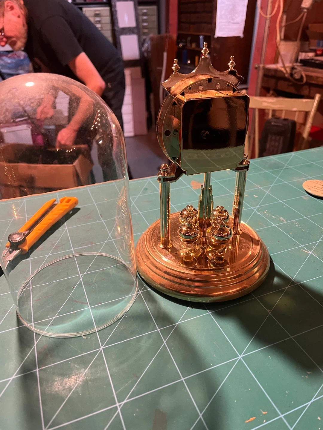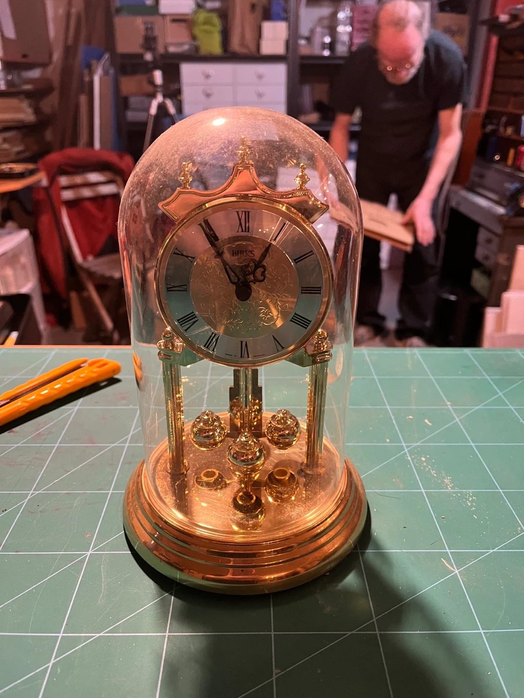 A decorative āfake brassā skeleton clock enclosed in a glass dome. The dome is glass but the clock is chrome plated plastic. It is so convincing that the Karrot value estimate guessed it to be brass.