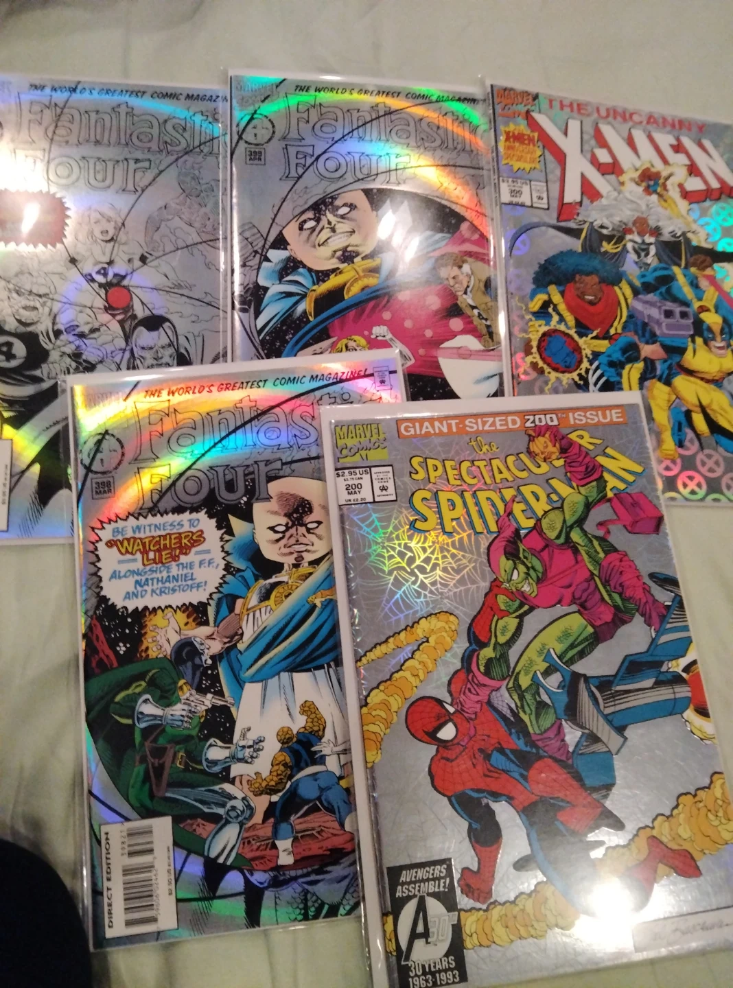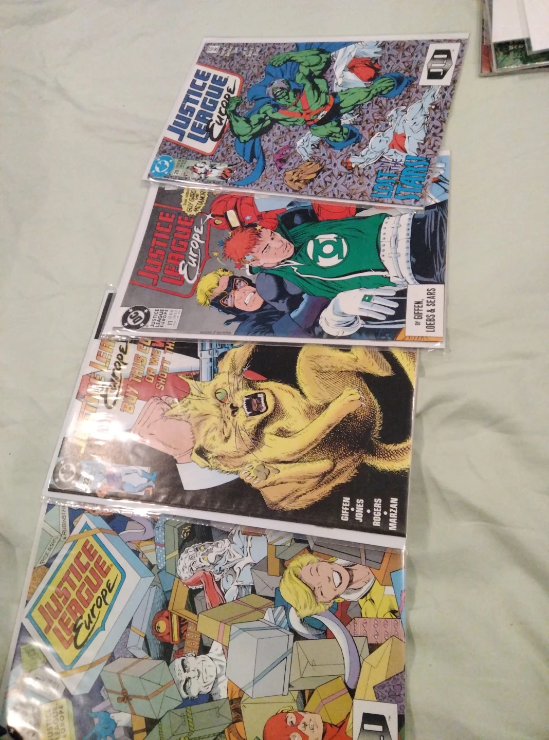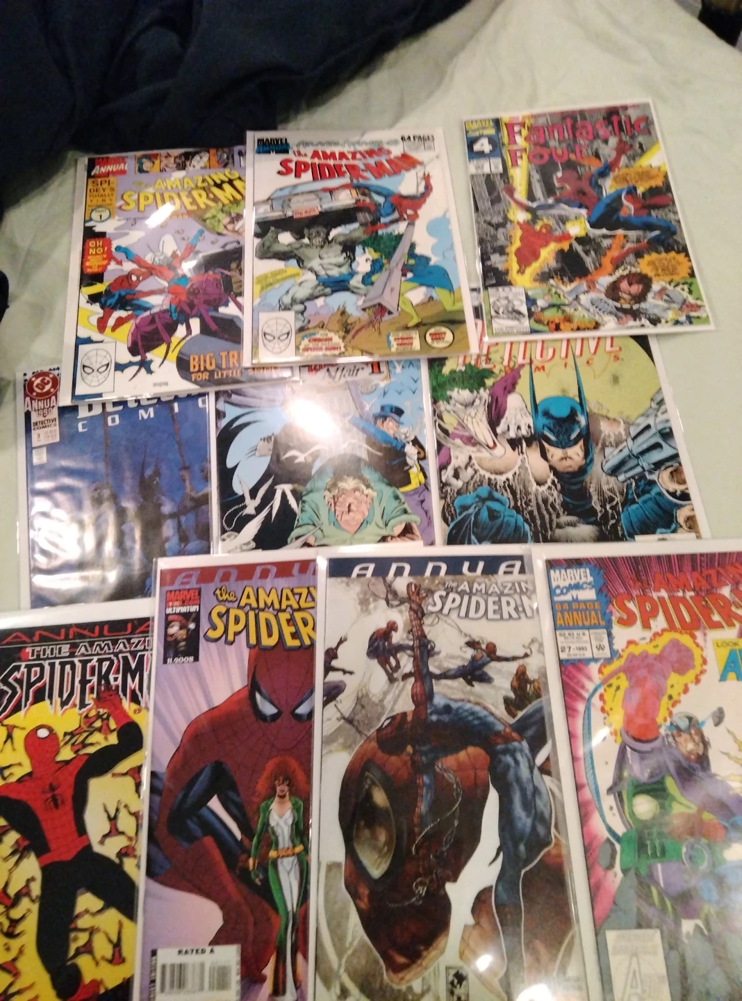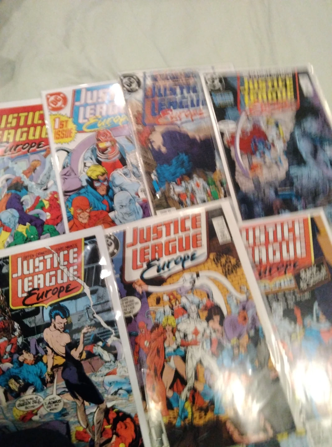A collection of various DC Comics including Justice League Europe and Batman titles, alongside Marvel Comics' The Amazing Spider-Man. These comics are in protective sleeves. They're great for any collector or fan of classic superhero stories. Also have venom and some ones that are chrome. 45 Comics.