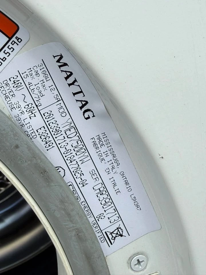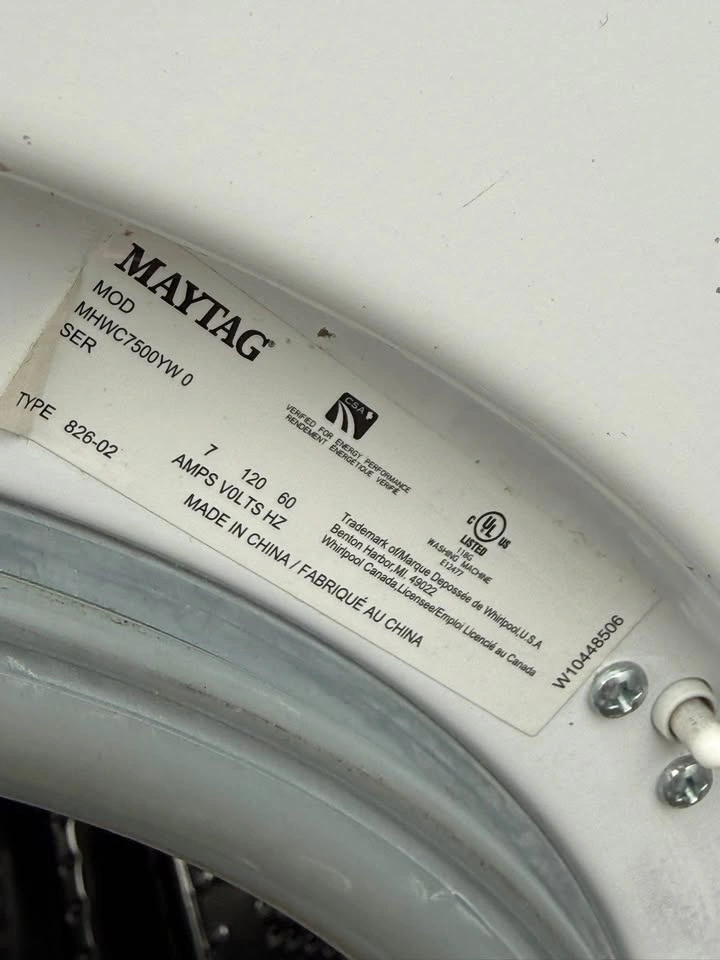 Clean Maytag stacked washer dryer unit with a front load design for both washer and dryer. Dryer model YMED7500YW and washer model MHWC7500YW0. Great for saving space in your laundry area.