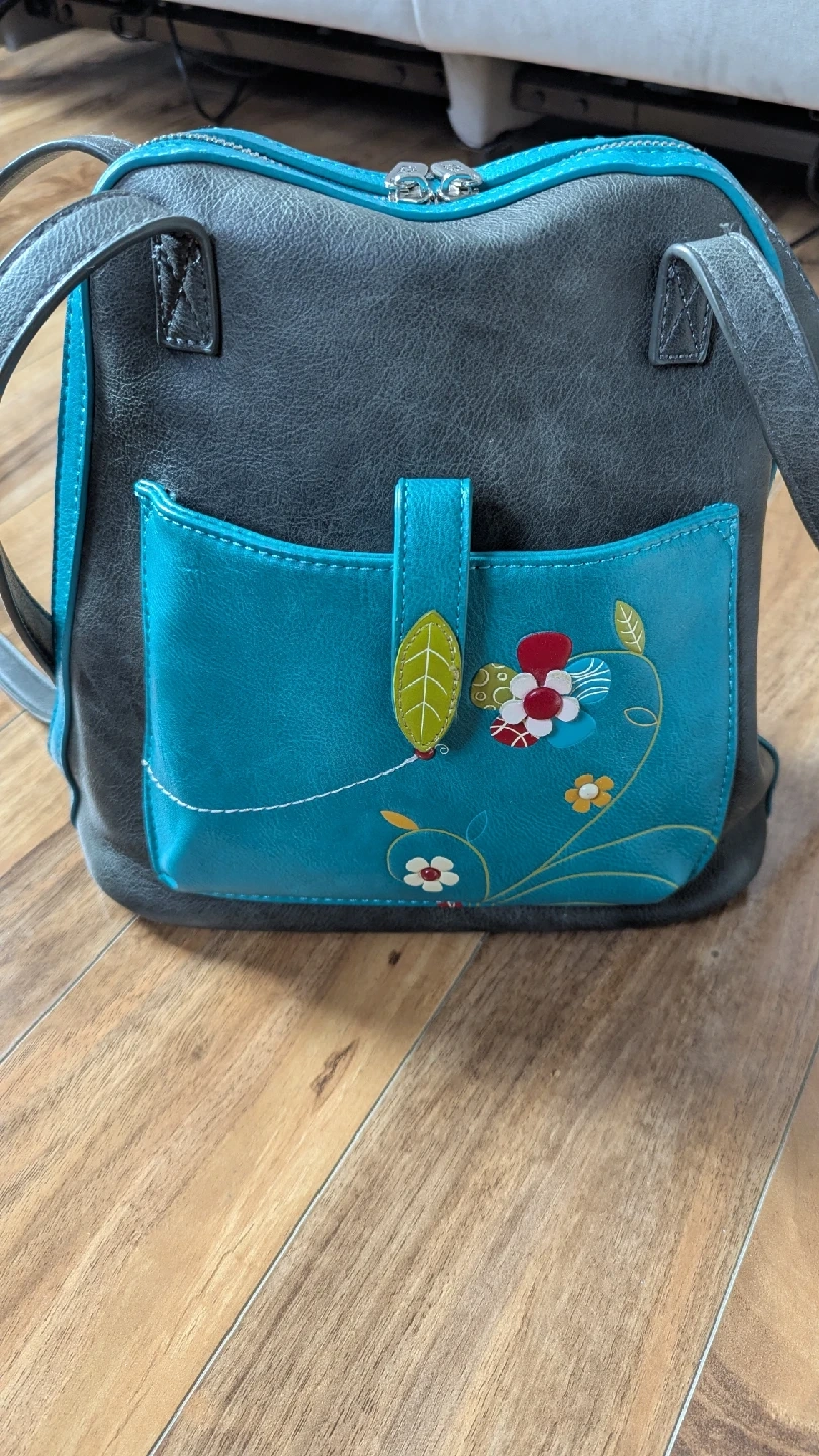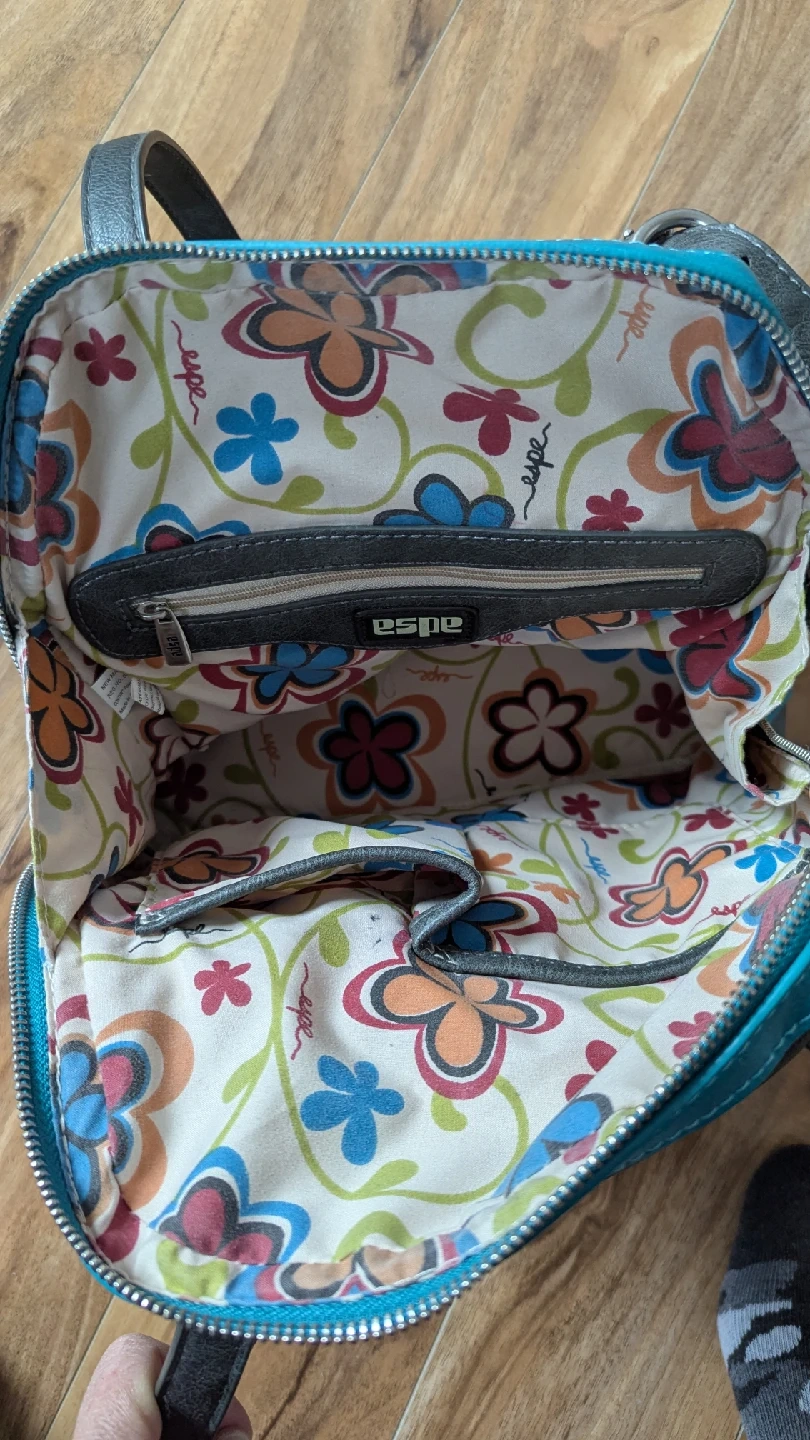 60Cute Espe vegan leather handbag in great condition! It's a stylish grey colour with turquoise accents. The inside has a fun floral pattern. Perfect for everyday use!