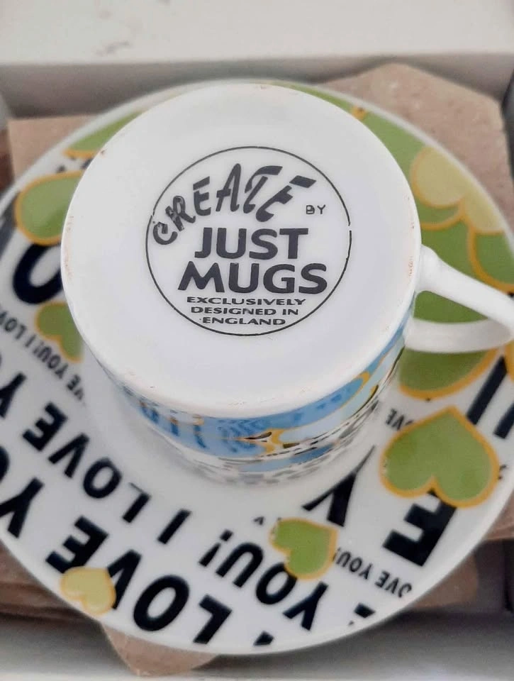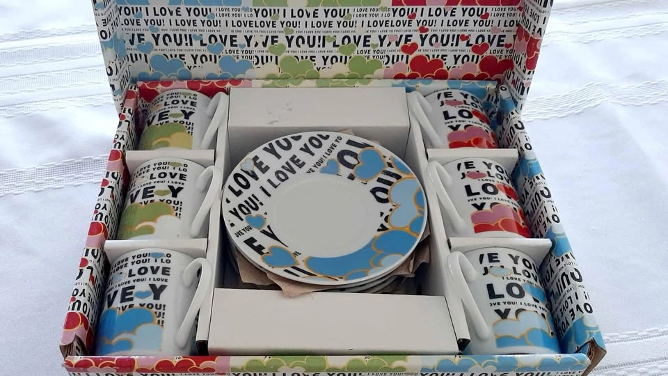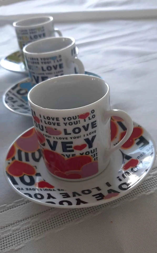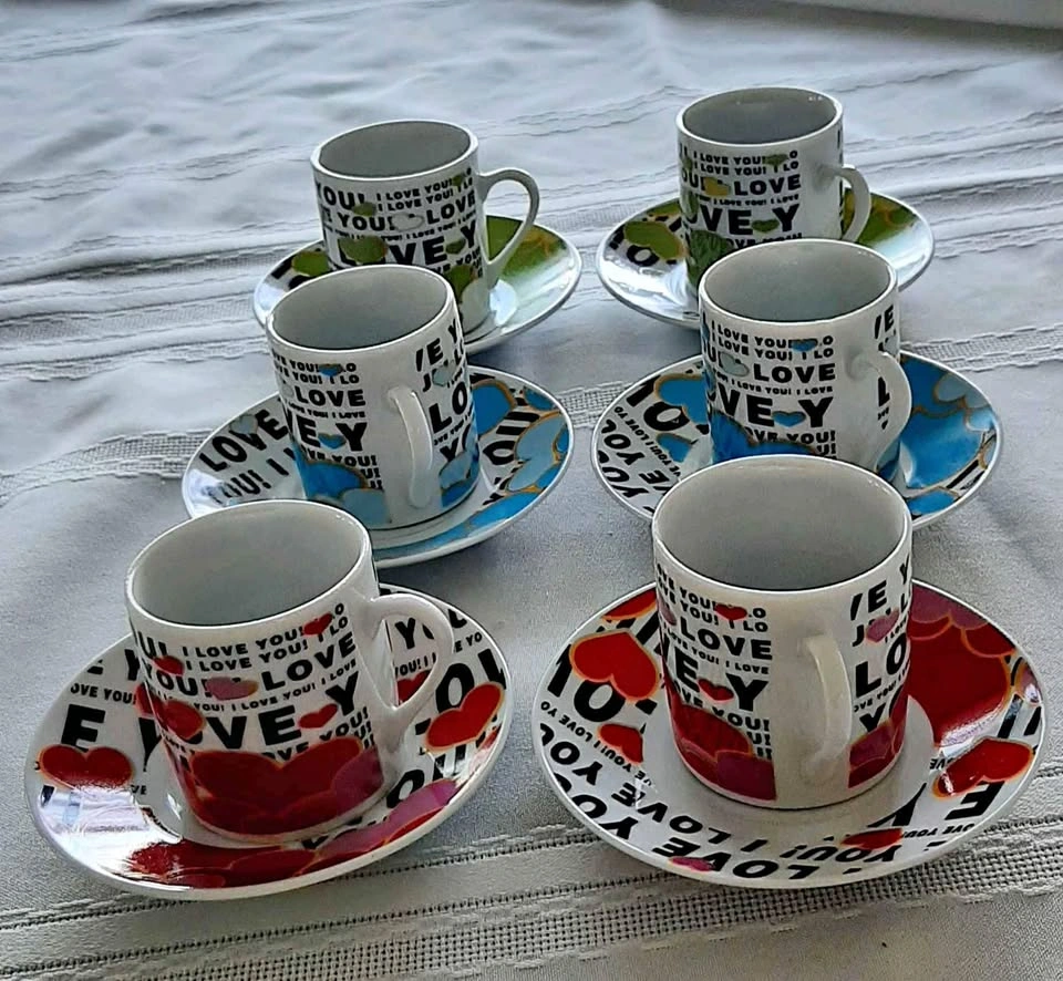 6 cups, 6 plates. 12 piece espresso set. New, never used. Box has wet storage damage but does not affect condition of the set itself. Made in England. English Porcelain.
