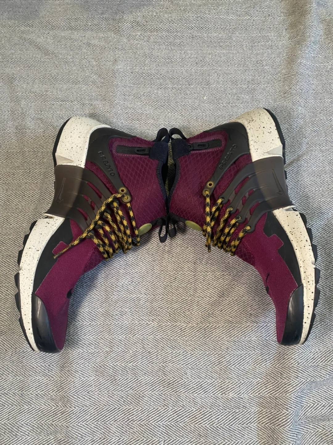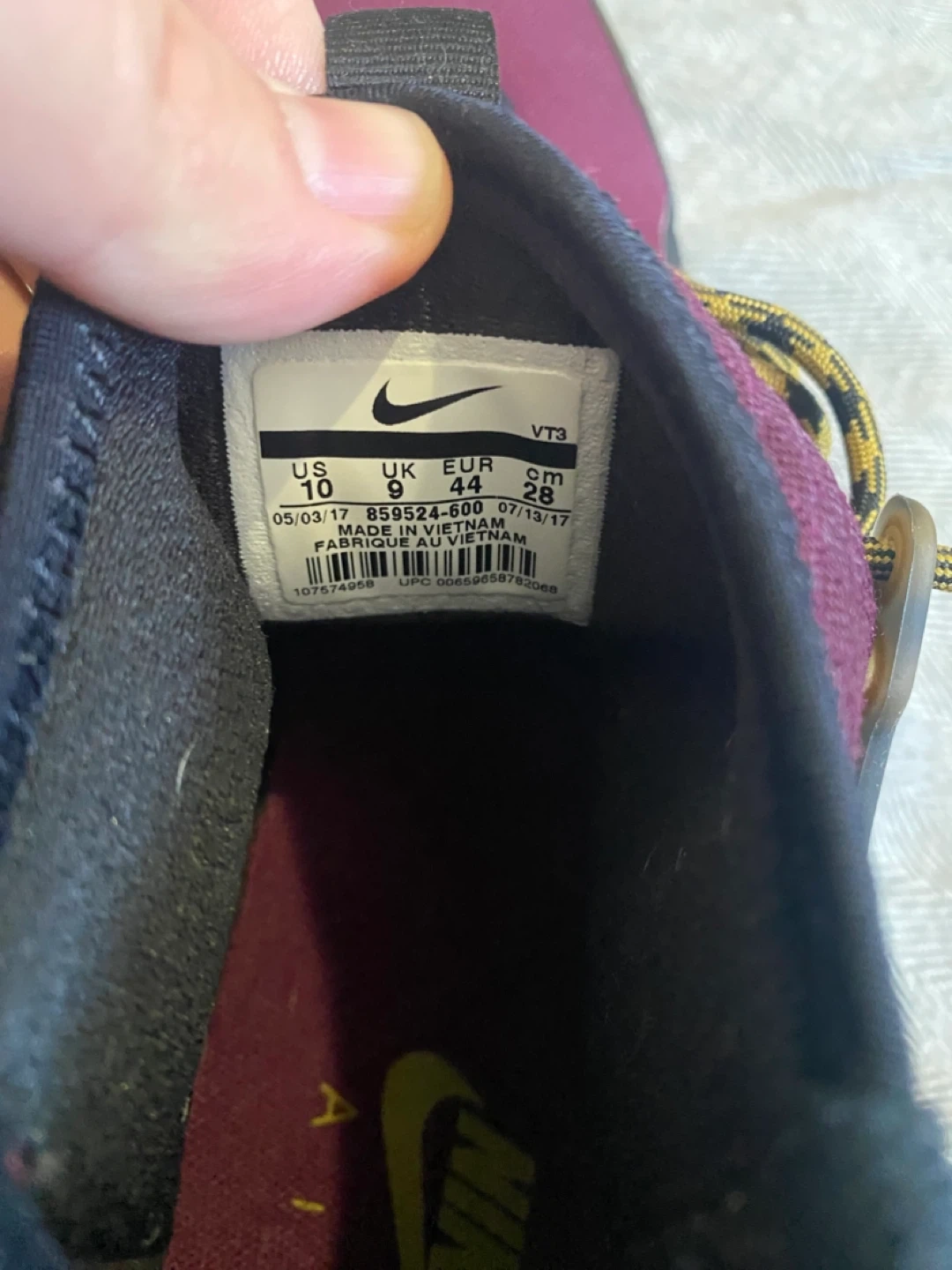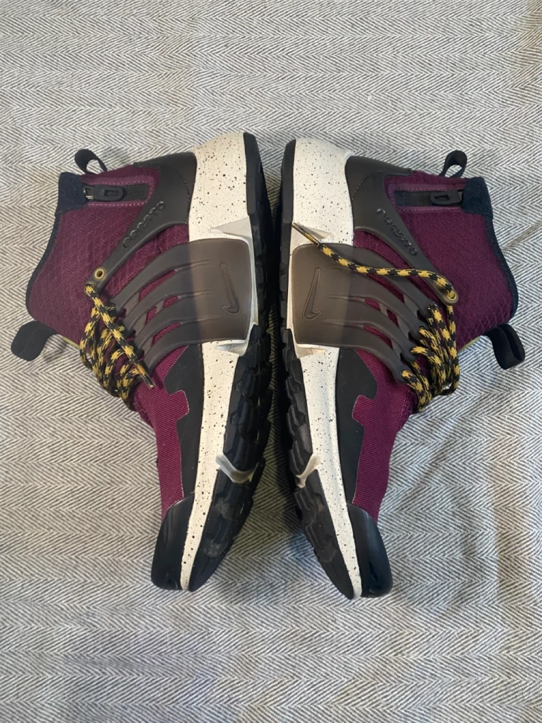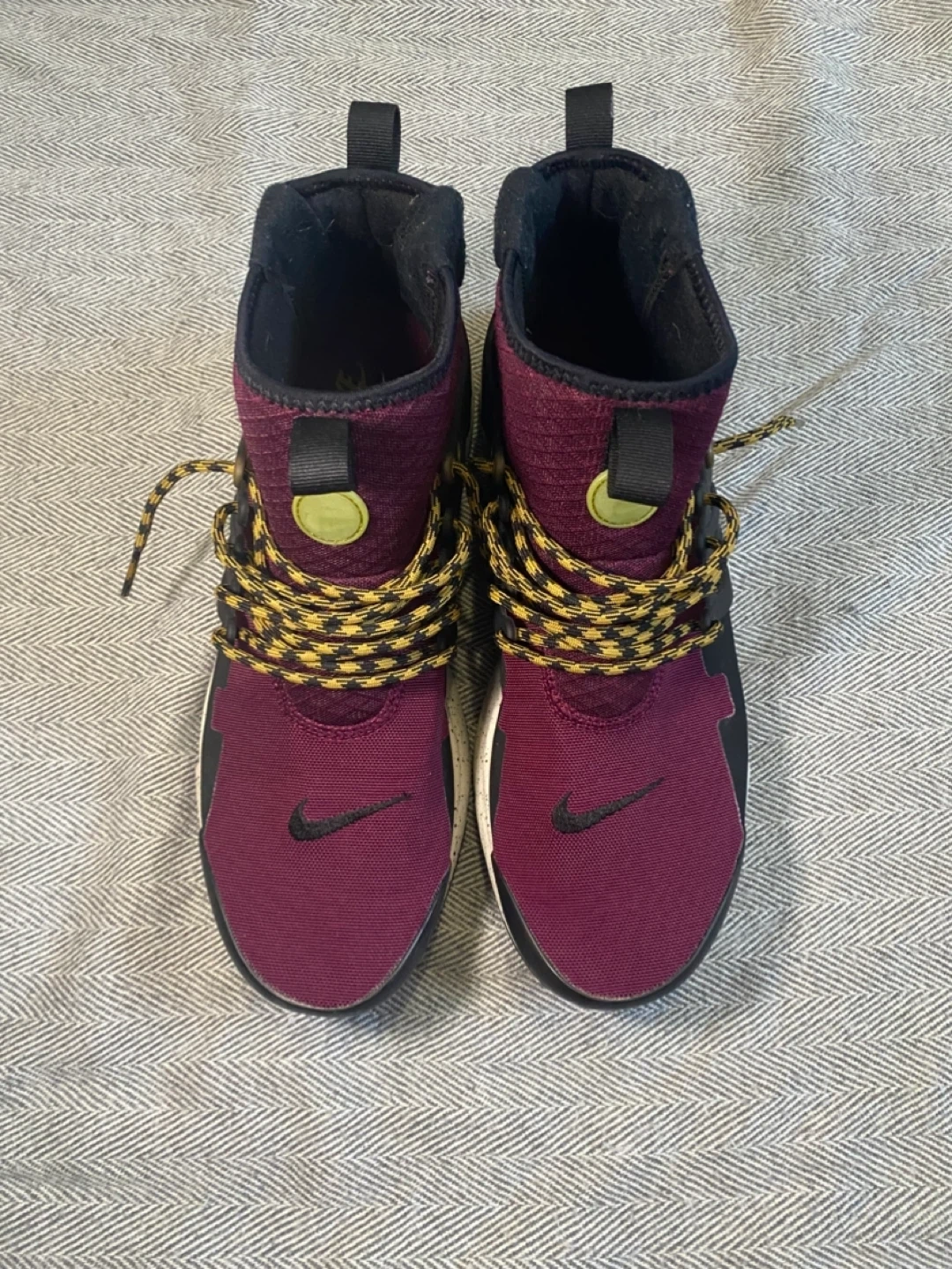 Selling a pair of Nike Air Presto Mid Utility shoes in size 10 US. They feature a unique burgundy and black colourway with speckled white accents. The laces are a cool yellow and black pattern. The soles show some signs of wear, but overall they're still in good condition!