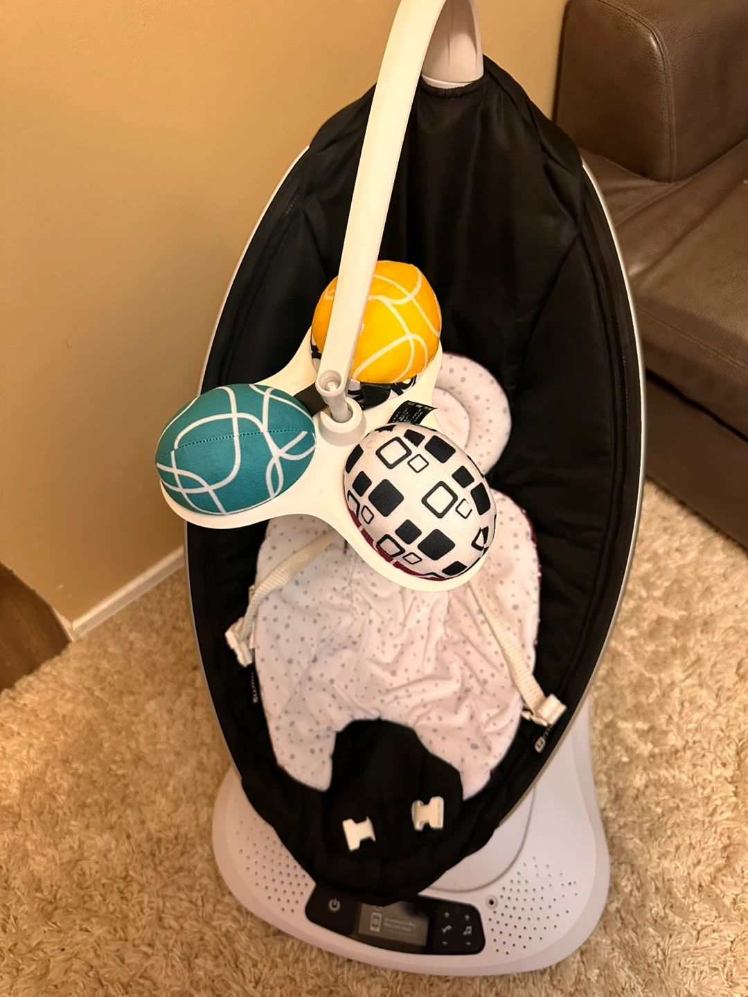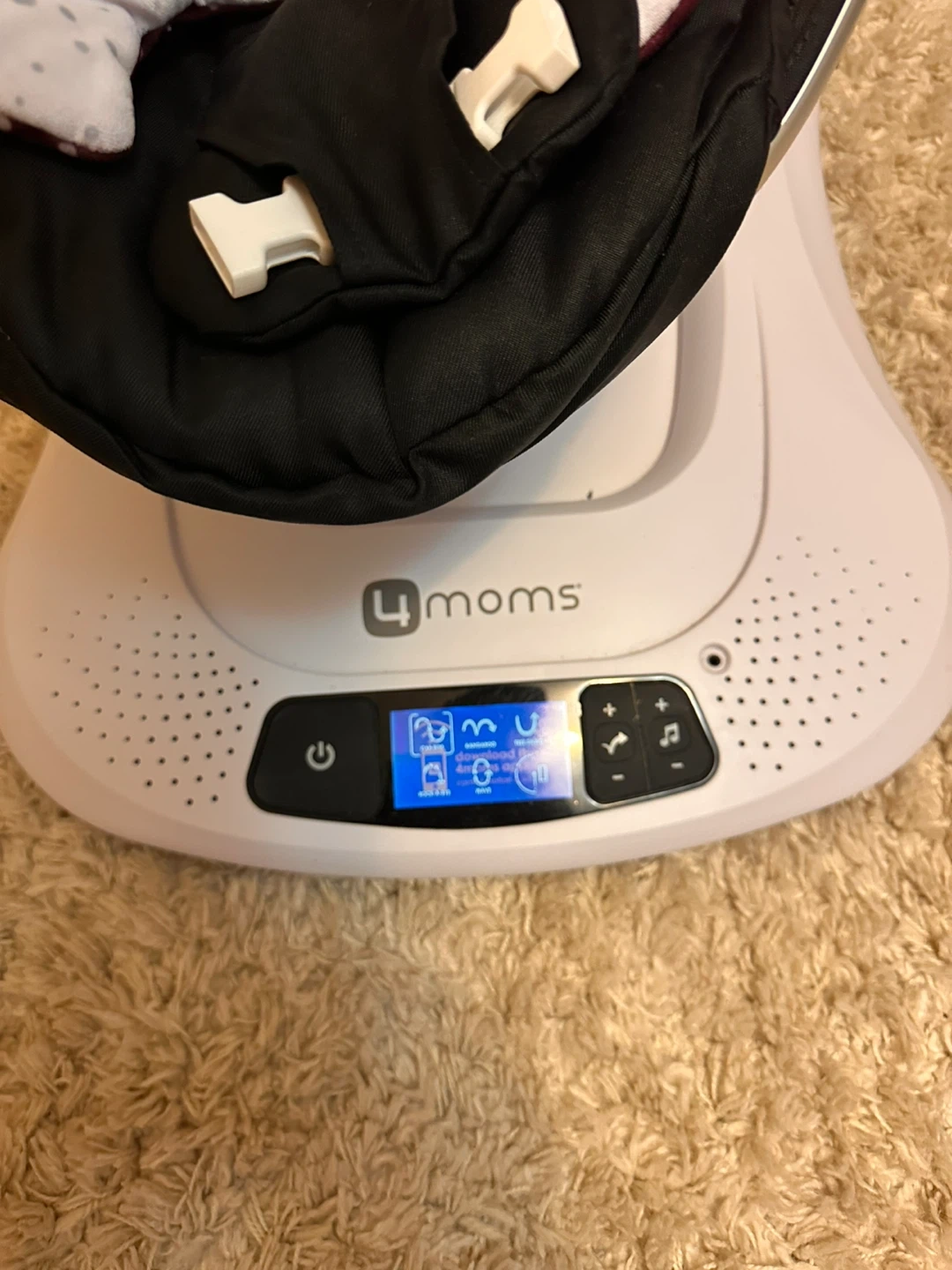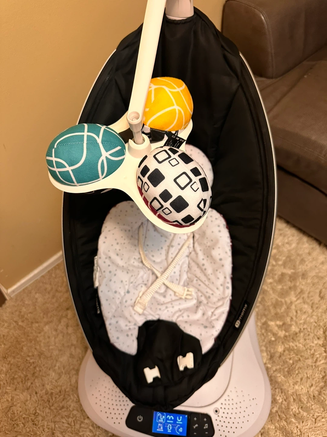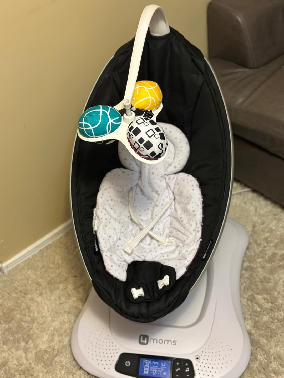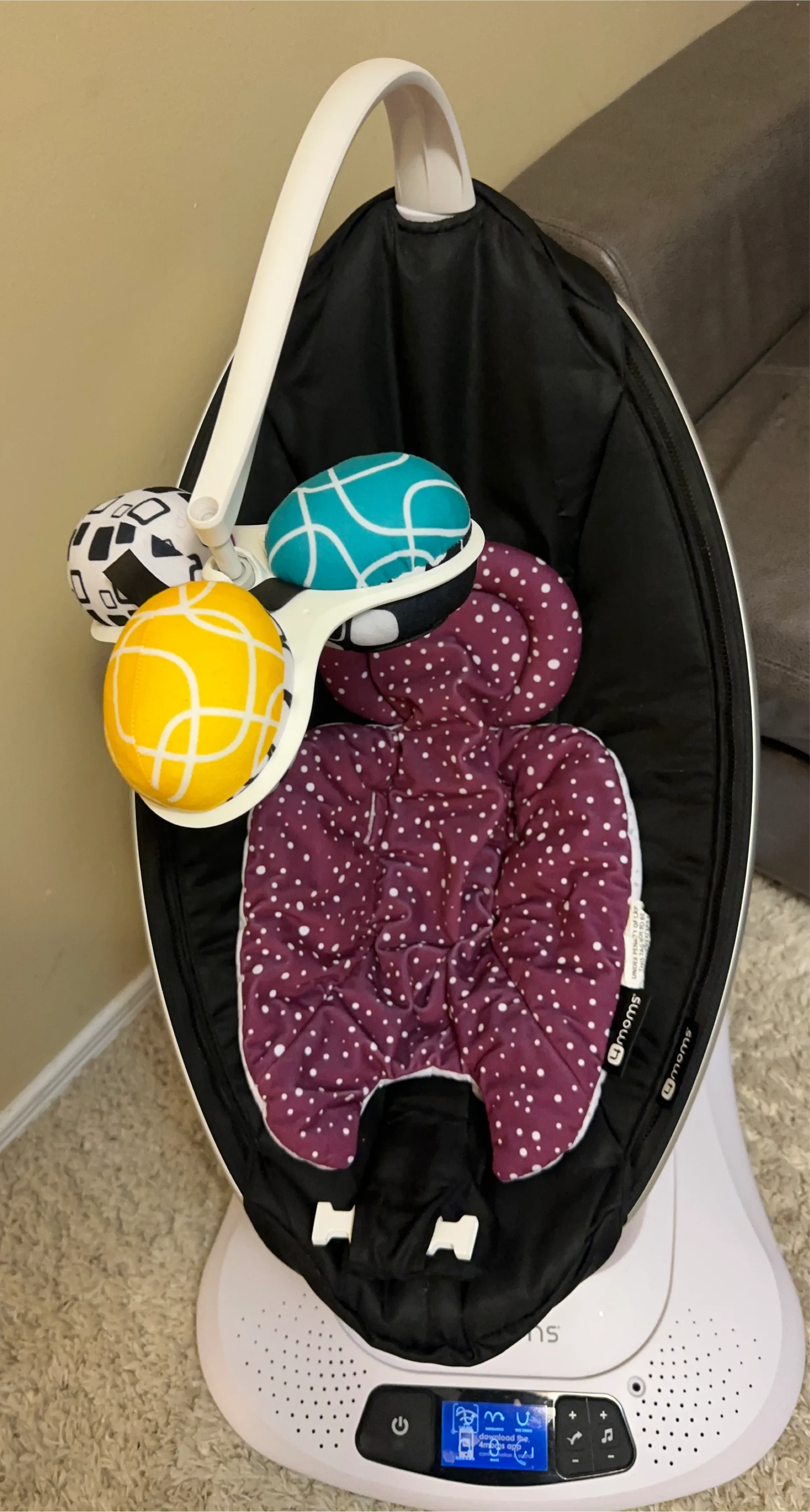 Selling a 4moms mamaRoo baby swing. It's in great condition and ready for a new little one! This swing has multiple motions and speeds to soothe your baby. The seat is black with a patterned purple insert. It also has an overhead mobile with colourful balls to entertain your baby