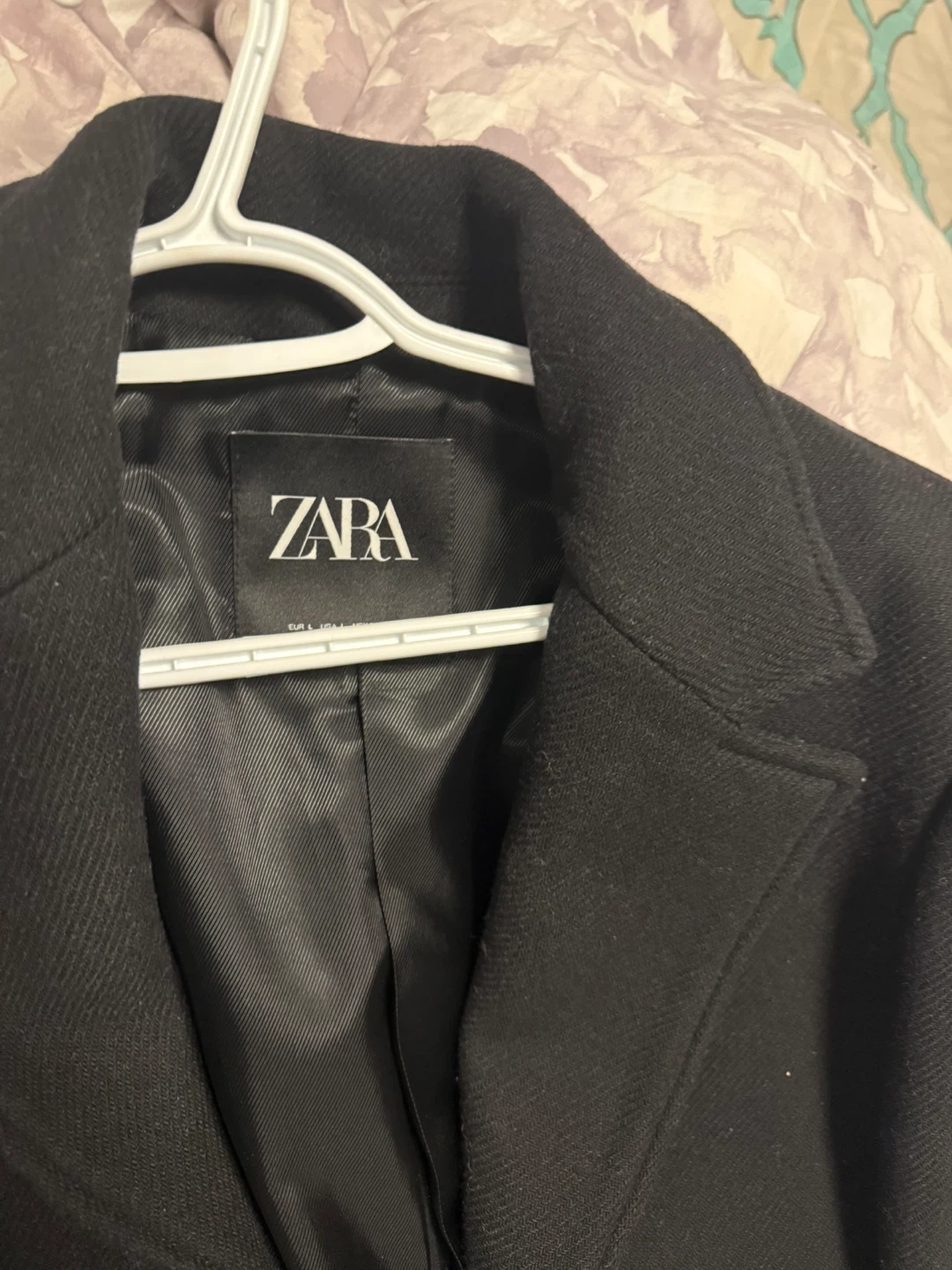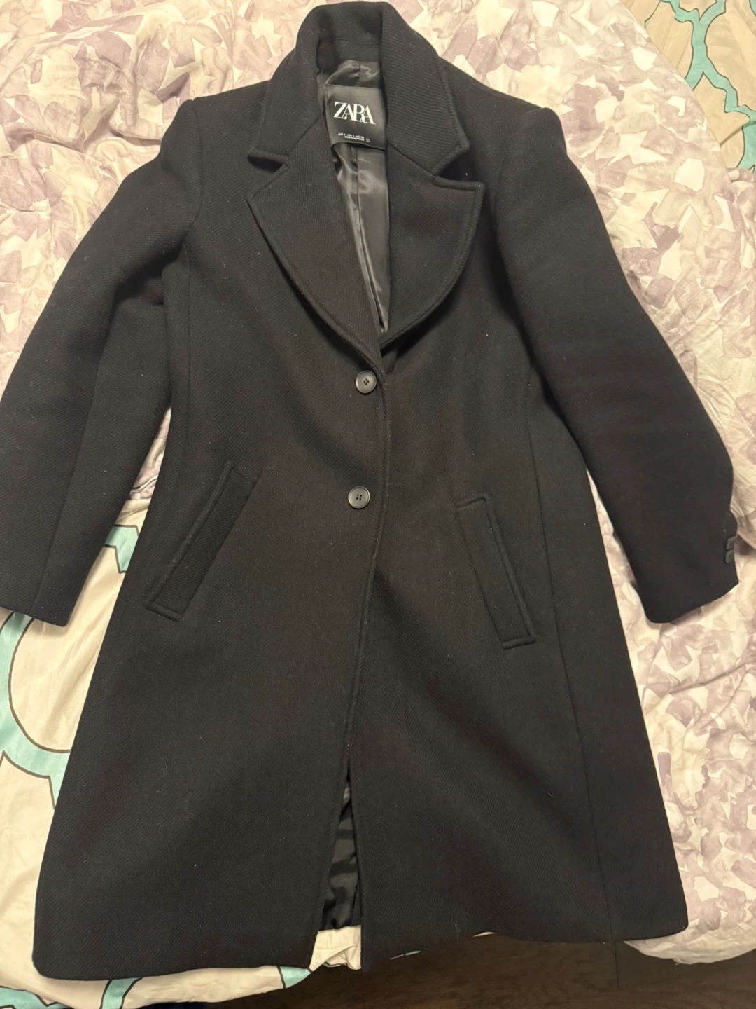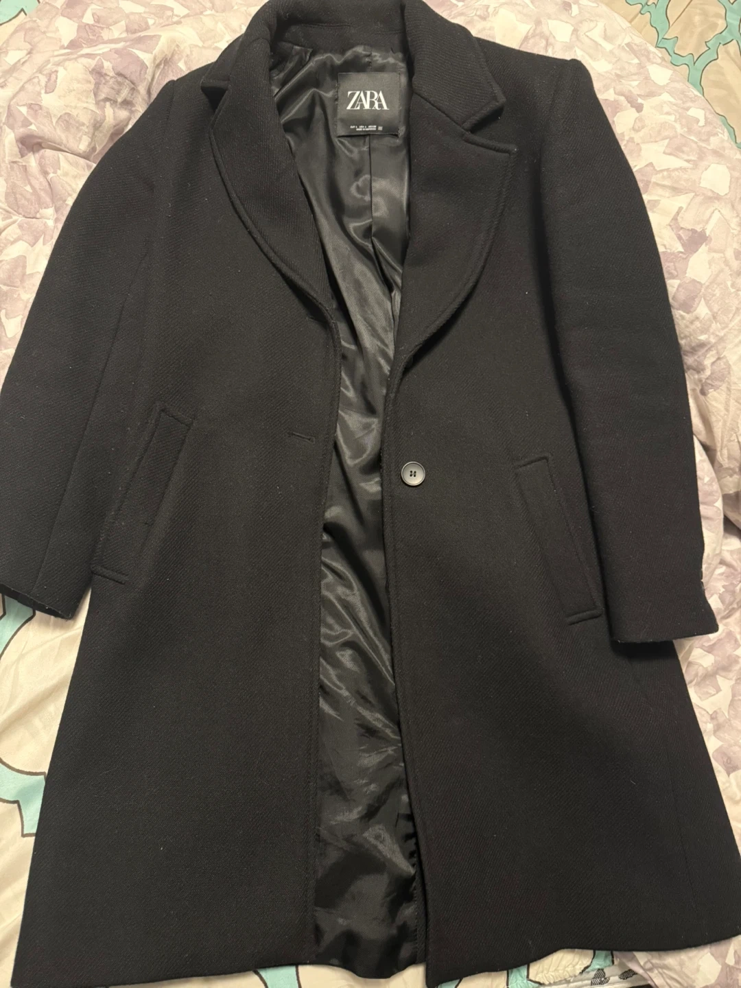 This Zara coat is a classic black colour and made from a wool blend fabric. It's a size Large with a satin lining. Features a single button closure and two front pockets.