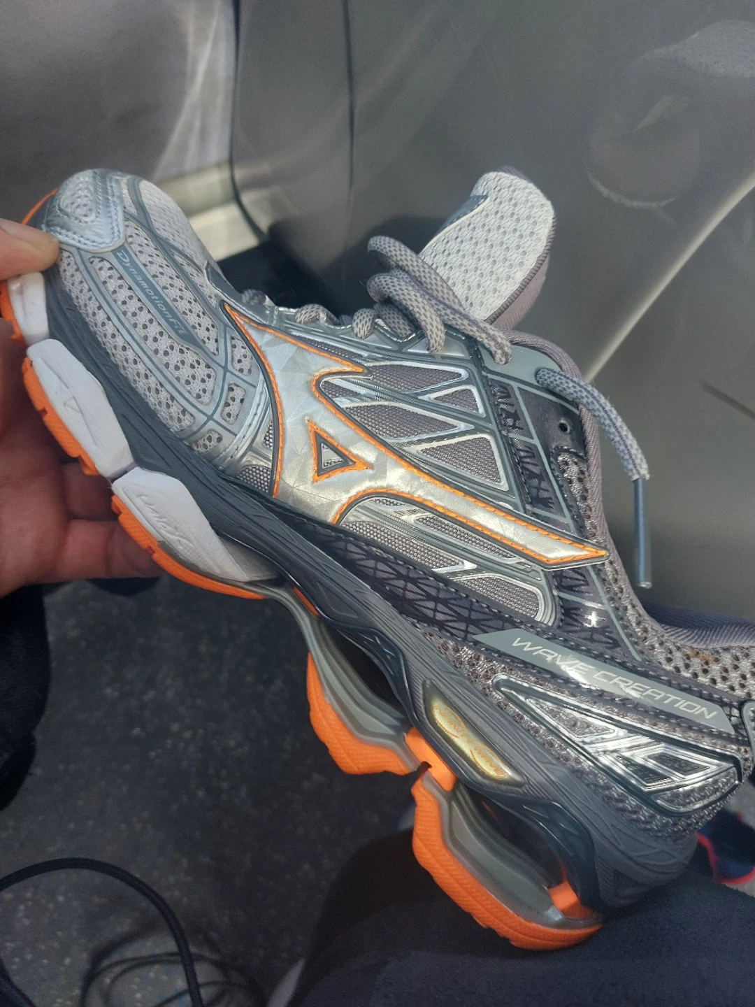 Mizuno Wave Creation running shoes in silver and orange. Mesh upper with synthetic overlays for support. Designed for athletic performance.