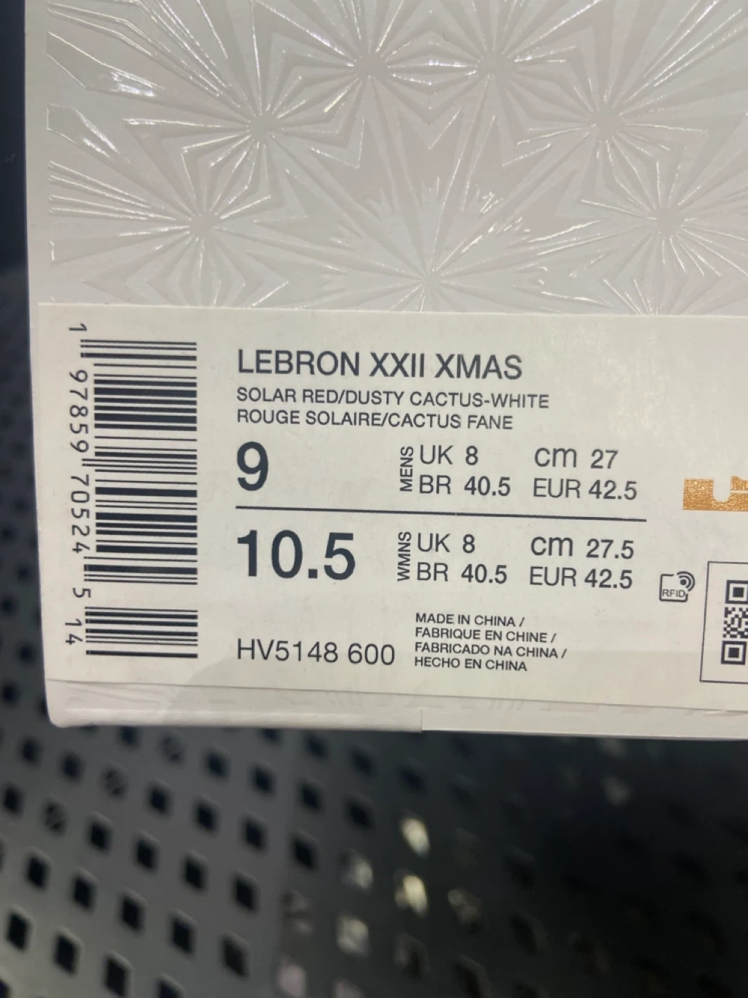 These Nike LeBron XXII Xmas shoes come in a vibrant Solar Red/Dusty Cactus-White colourway. They include extra mint green Nike laces. A UK size 8 (US men's 9) shoe. This pair is perfect for basketball players or collectors!