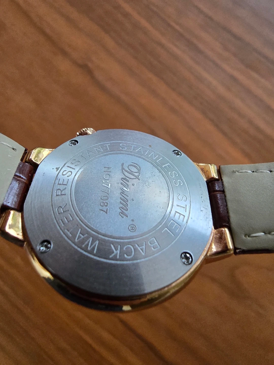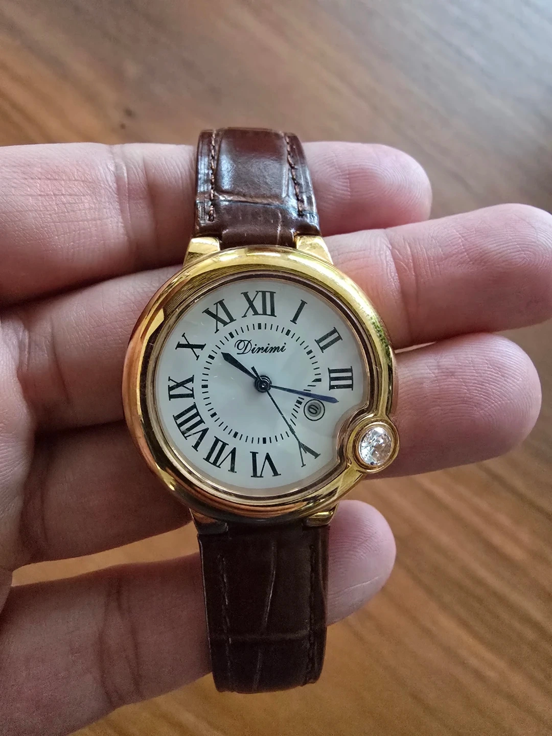 Beautiful Dinimi watch in excellent condition. Features a timeless gold-tone case with Roman numeral dial and a diamond accent on the side, giving it a refined and elegant look. Paired with a brown leather strap that complements both formal and everyday outfits.
