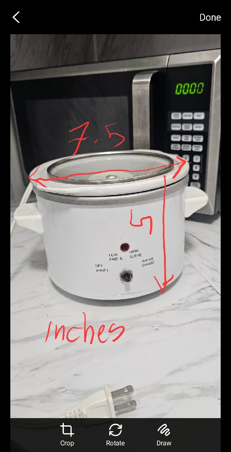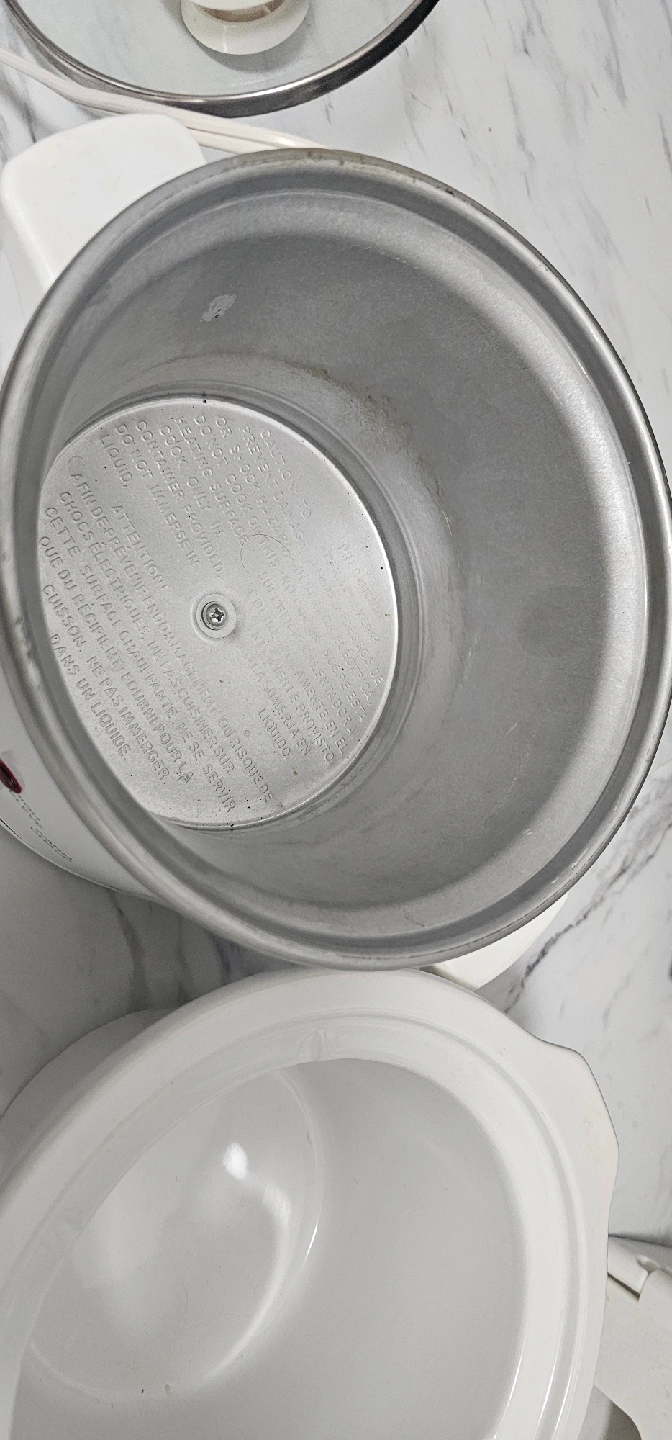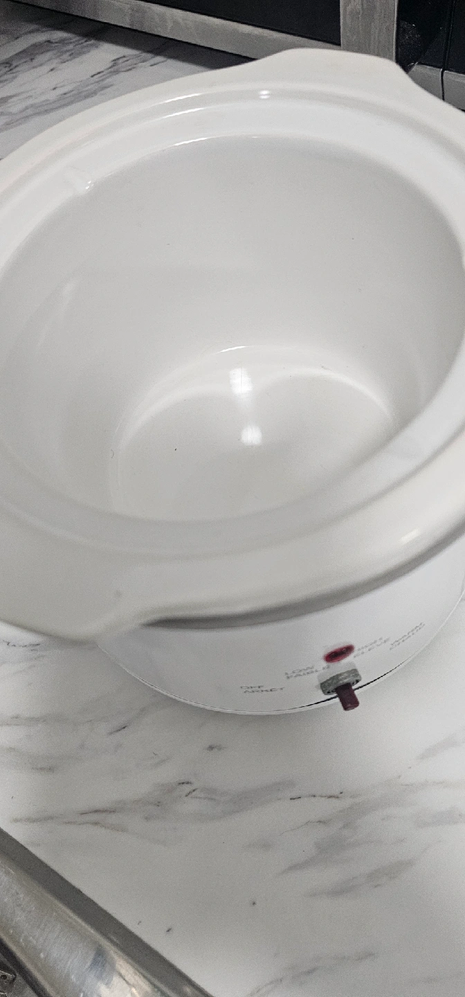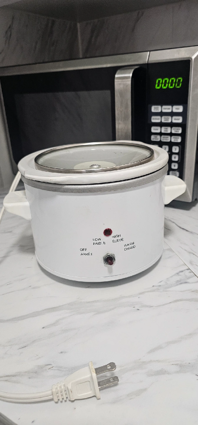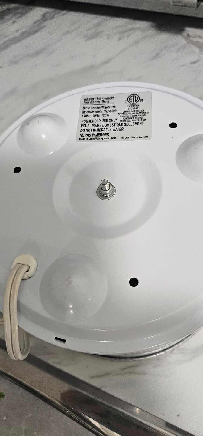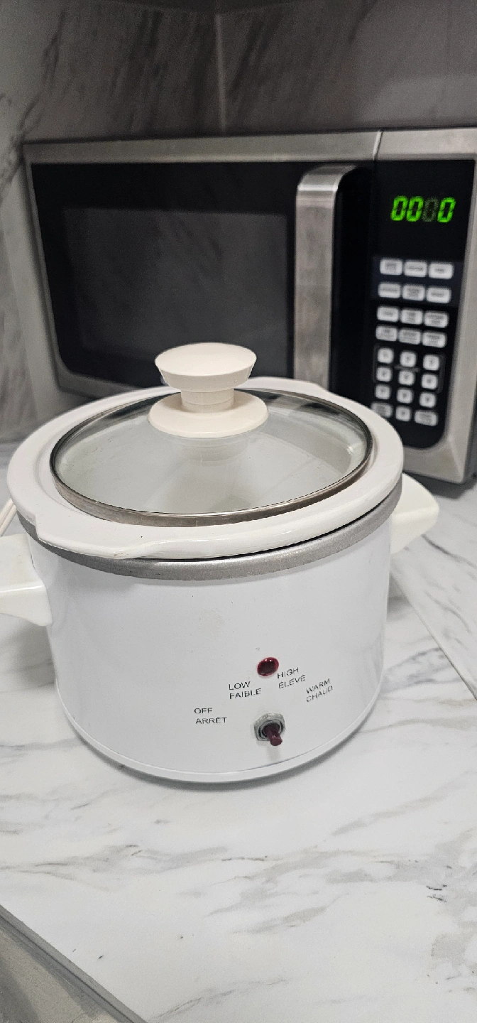 Selling a mini slow cooker by Essential Needs. It's white and has a glass lid. It has settings for off, low, high, and warm. Model number is NJ-1509.