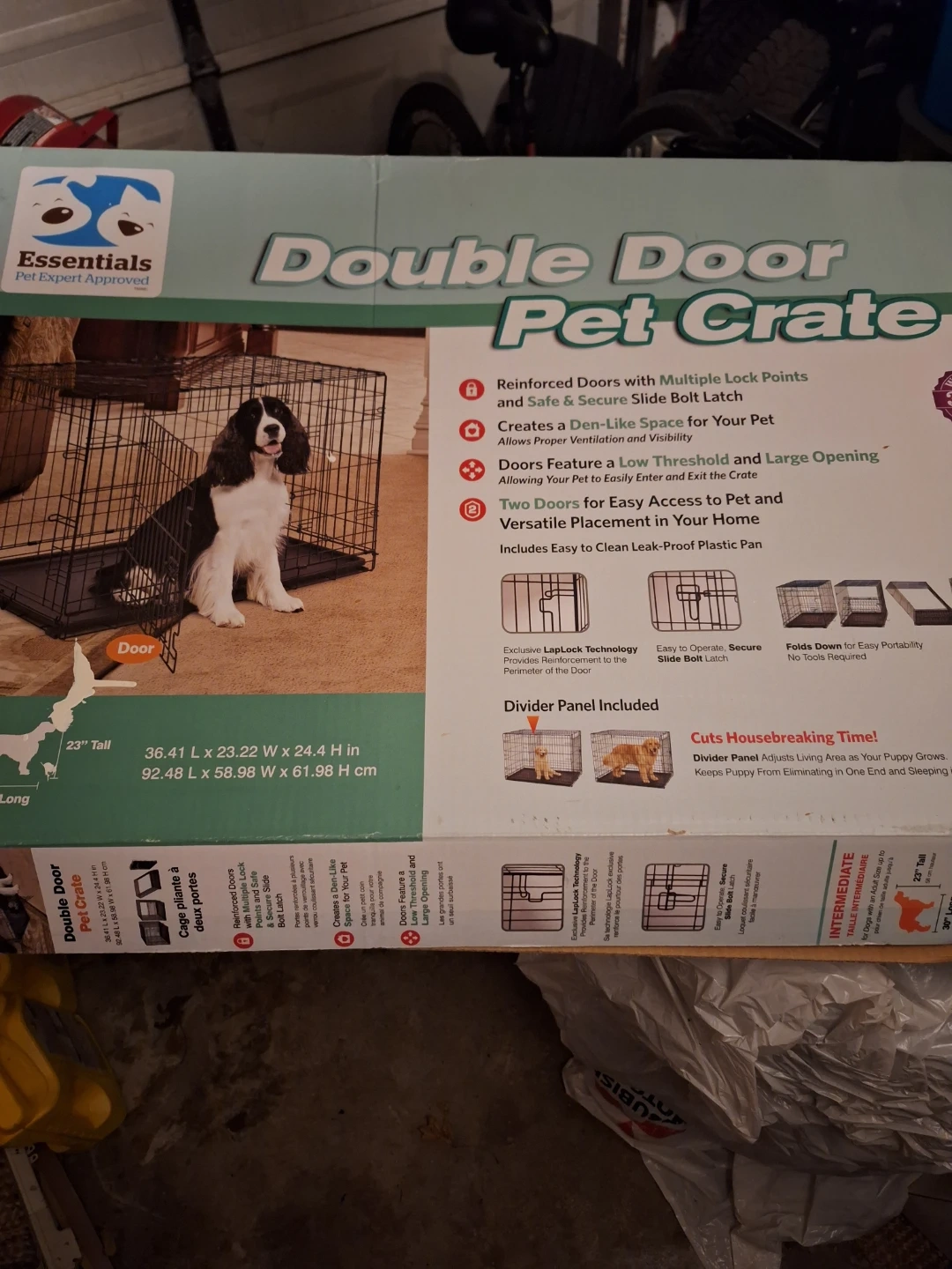 65Selling an Essentials Double Door Pet Crate. It's in great shape and ready for a new home! - Dimensions: 30 inches long, 23 inches tall - Features reinforced doors with multiple lock points and a safe & secure slide bolt latch - Creates a den-like space for your pet for added relaxation and visibility - Includes an easy to clean leak-proof plastic pan - Folds down easily for portability - no tools required - A divider panel is included, which adjusts the living area as your puppy grows