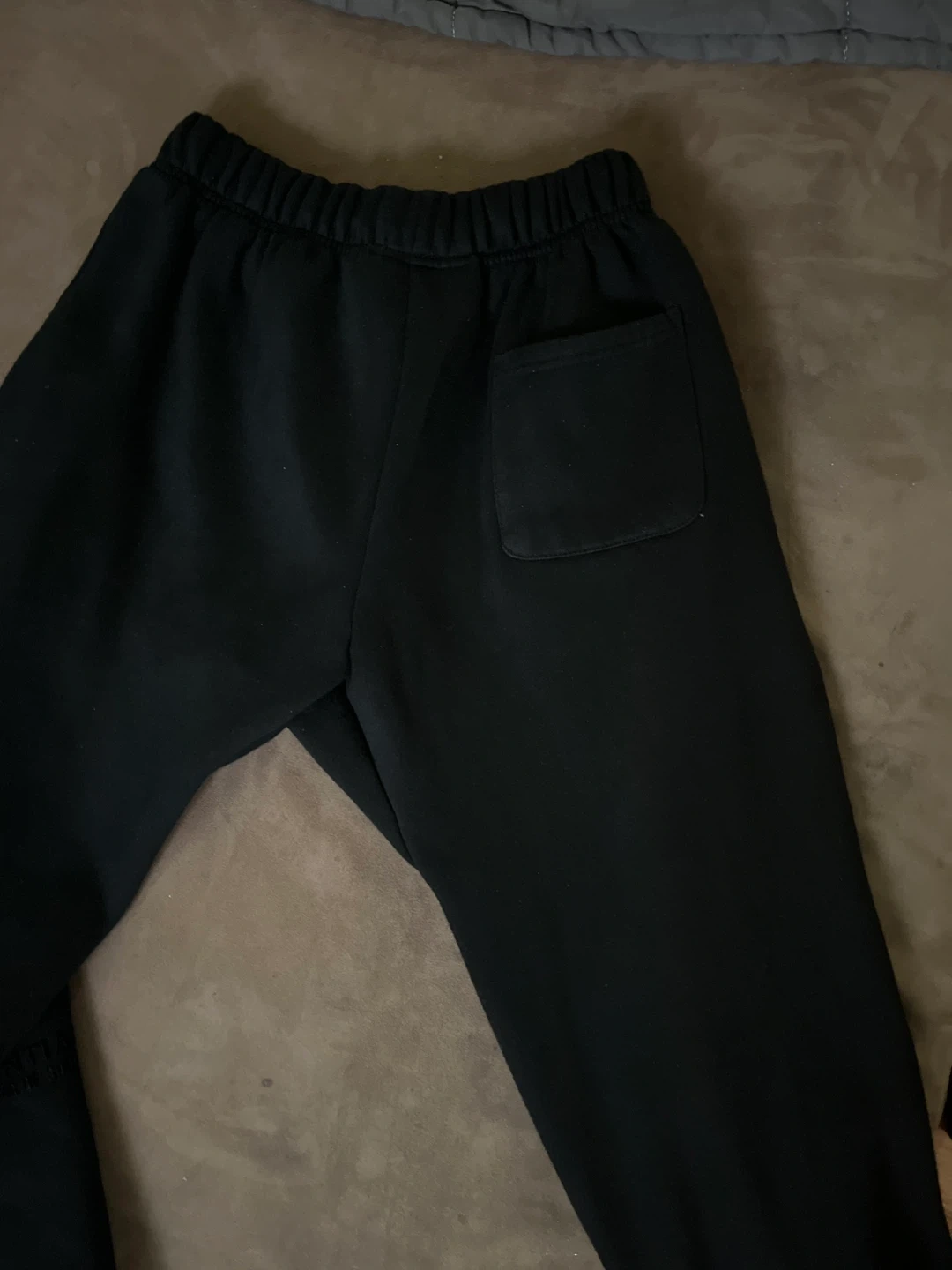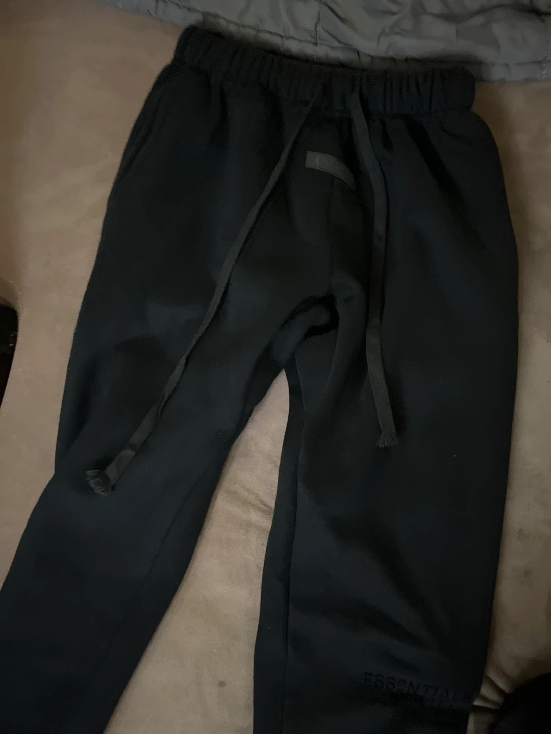 10Selling a pair of Essentials Fear of God sweatpants in black. They're in great condition and super comfy! Only problem is the draw strings are a bit damaged at the end of them, second photo. No receipt. Medium size men’s, negotiable price. DM me for any inquiries.