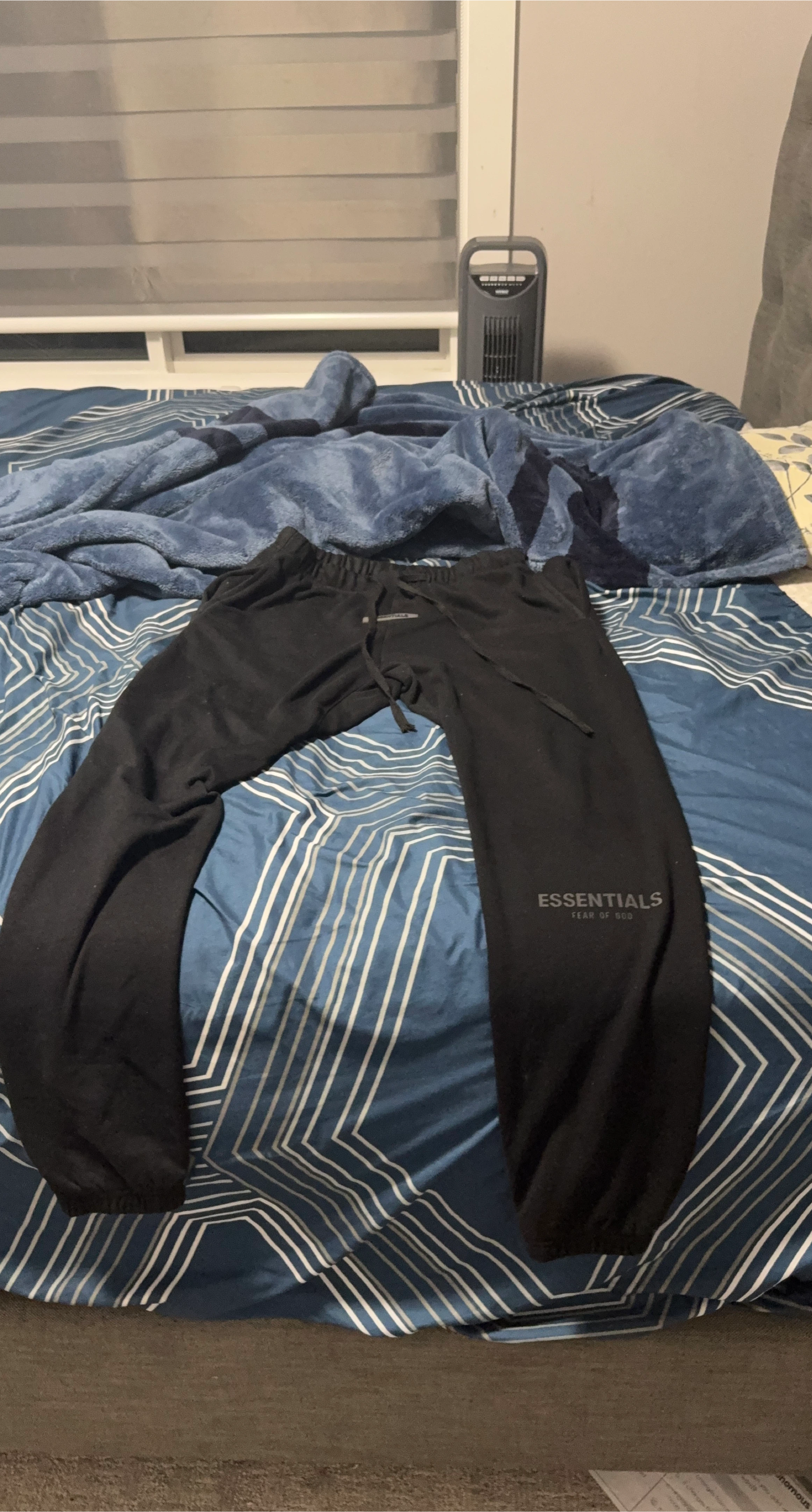 Selling a pair of Essentials Fear of God sweatpants in black. They're in great condition and super comfy for lounging around the house or running errands!