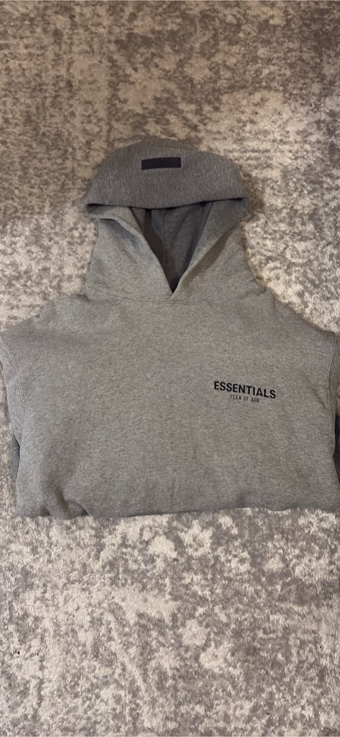 10Selling a grey Essentials Fear of God hoodie. It's in great condition and features the classic Essentials logo on the back. Perfect for casual wear! ( the hoodie looks wet in the photos because it was washed) it is slightly used