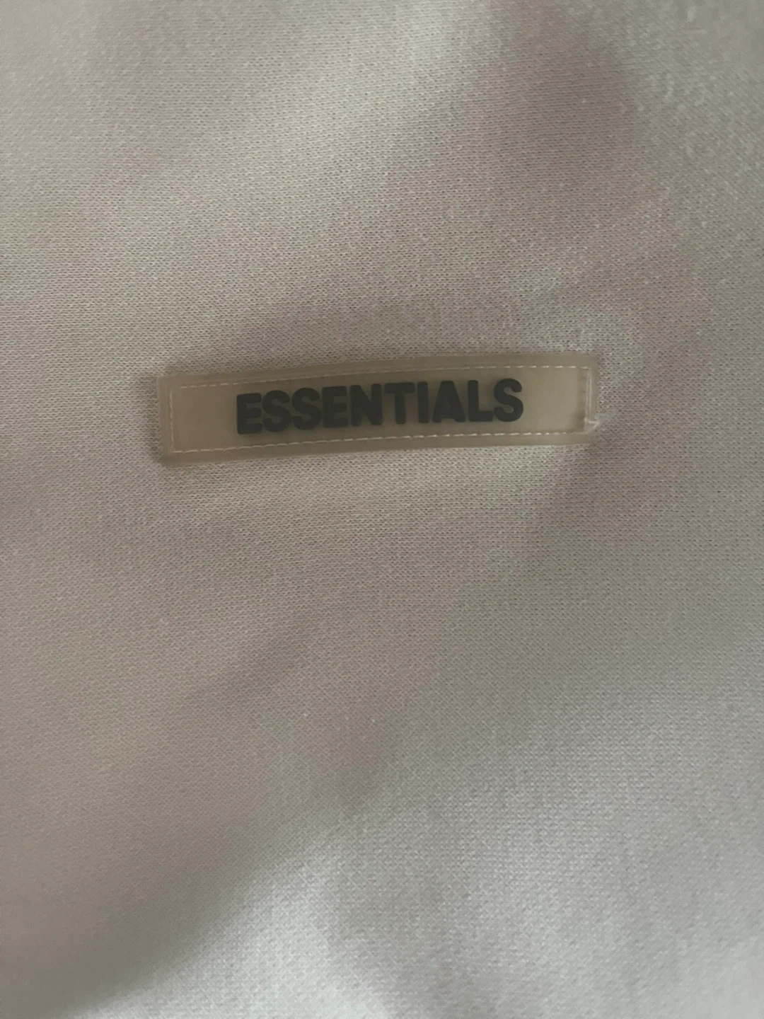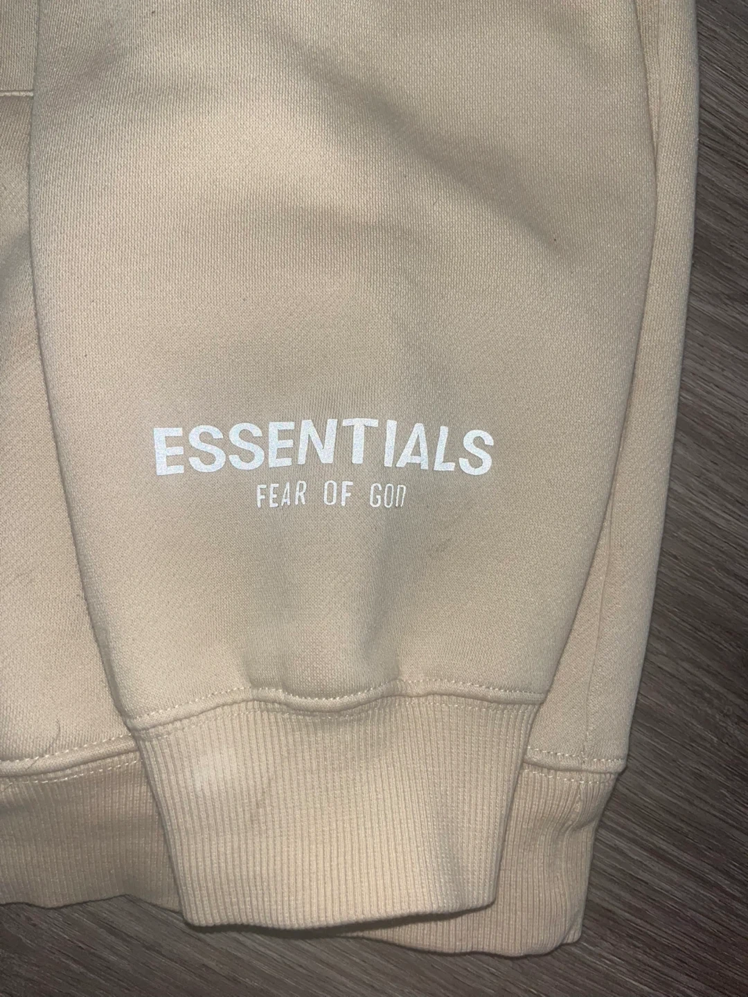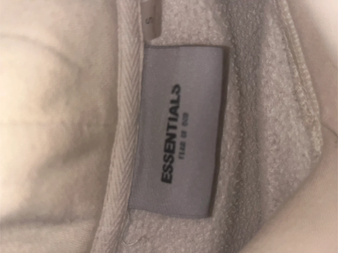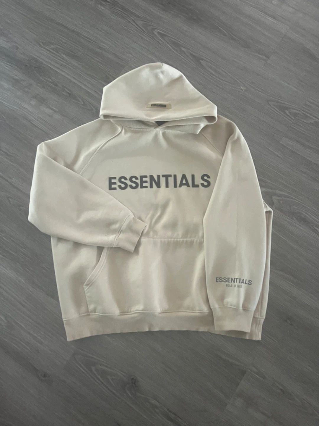 Cozy Essentials Fear of God hoodie in a neutral tone, size small. The hoodie features the 'ESSENTIALS' logo across the chest and on the sleeve. Perfect for layering or lounging!
