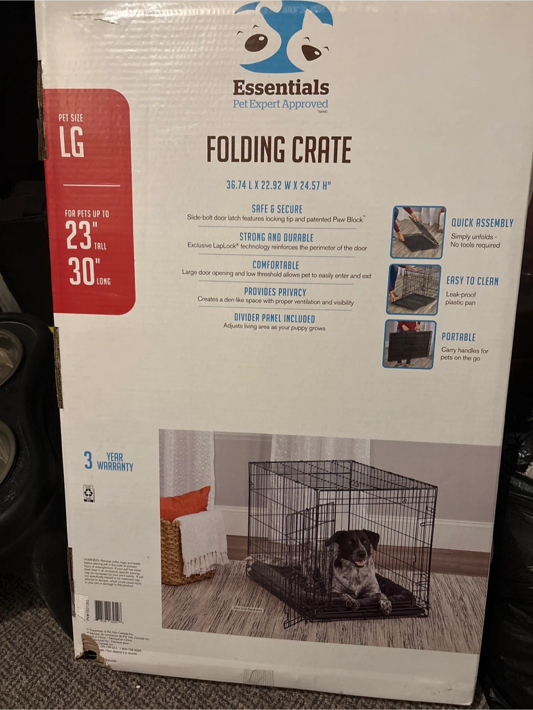 10Selling an Essentials folding dog crate, size large (LG). It's designed for pets up to 23 inches tall and 30 inches long. Key features include: - Safe & secure slide-bolt door latch with Paw Block - Strong and durable LapLock technology - Comfortable large door opening and low threshold - Provides privacy with proper ventilation and visibility - Divider panel included to adjust the living area as your puppy grows - Quick assembly, simply unfolds, no tools required - Easy to clean with a leak-proof plastic pan - Portable with carry handles for pets on the go