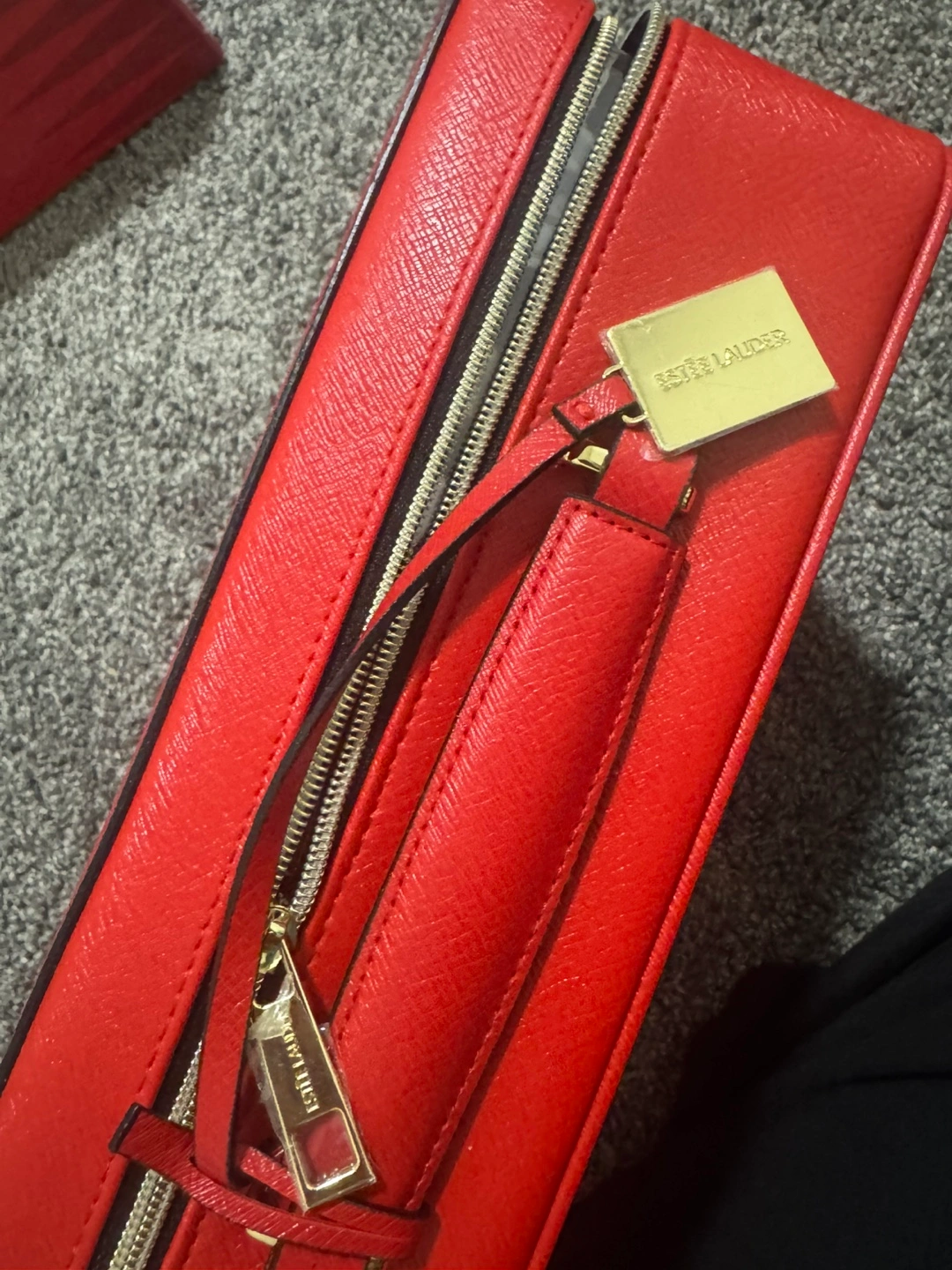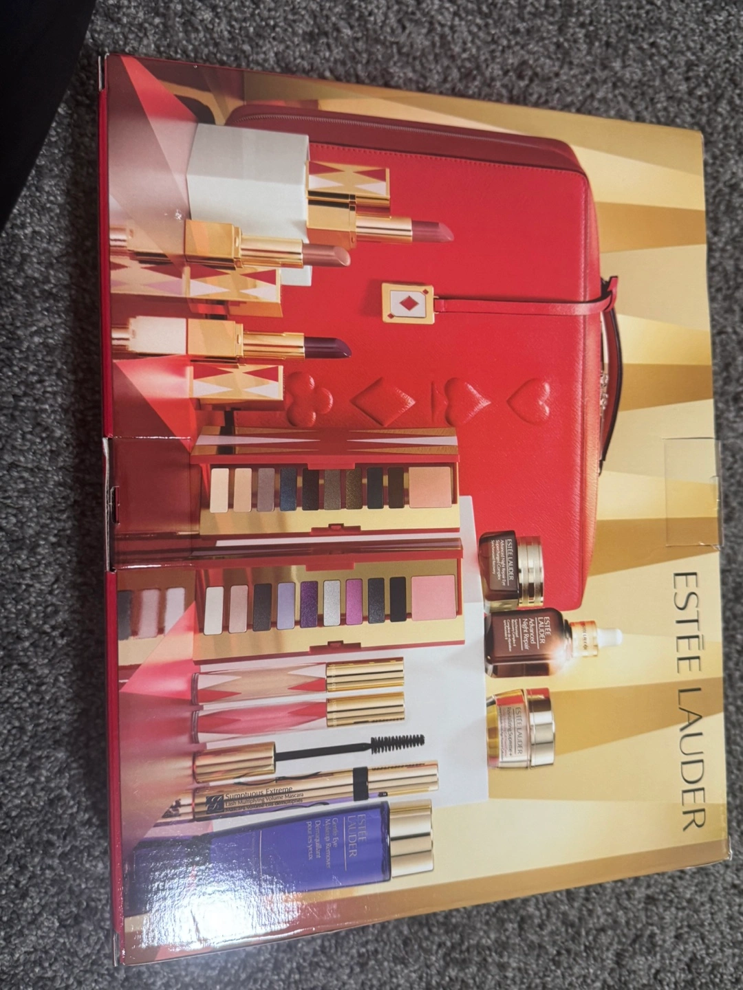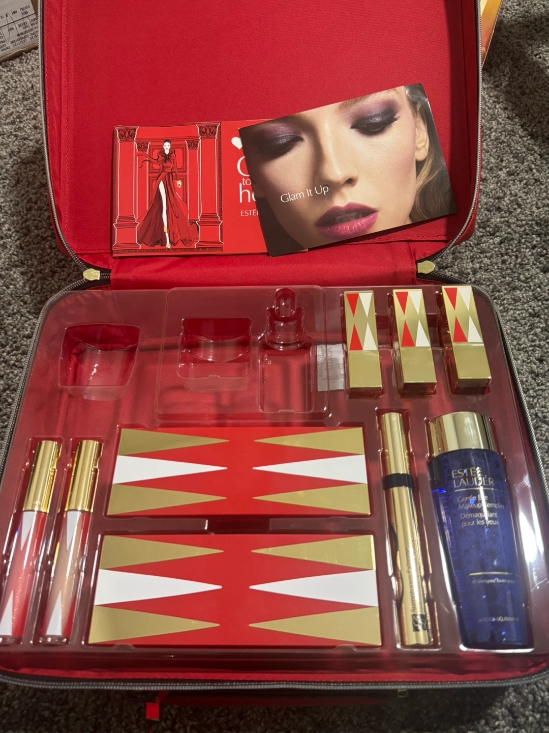 Estee Lauder holiday gift set. Includes a striking red bag. Perfect for any makeup lover. 3 skin care products( advanced night repair, eye repair cream & day cream) is missing. Rest is untouched.