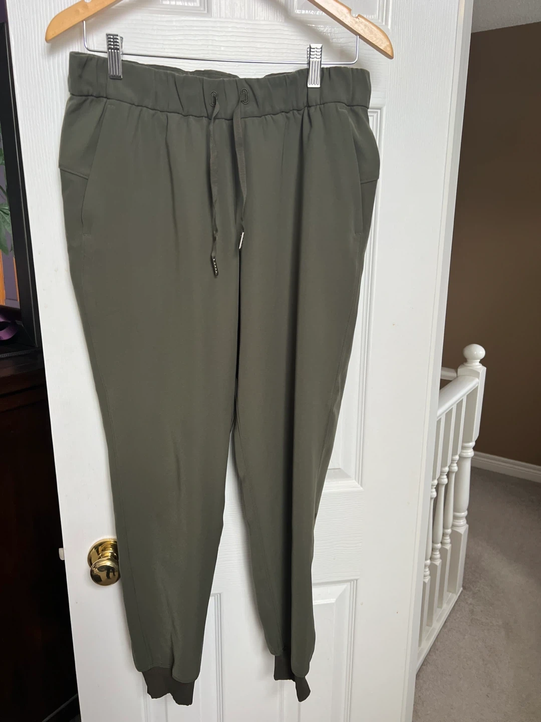Lululemon joggers in olive green. These pants are a size 8. They have an elastic waistband with a drawstring and cuffed ankles.