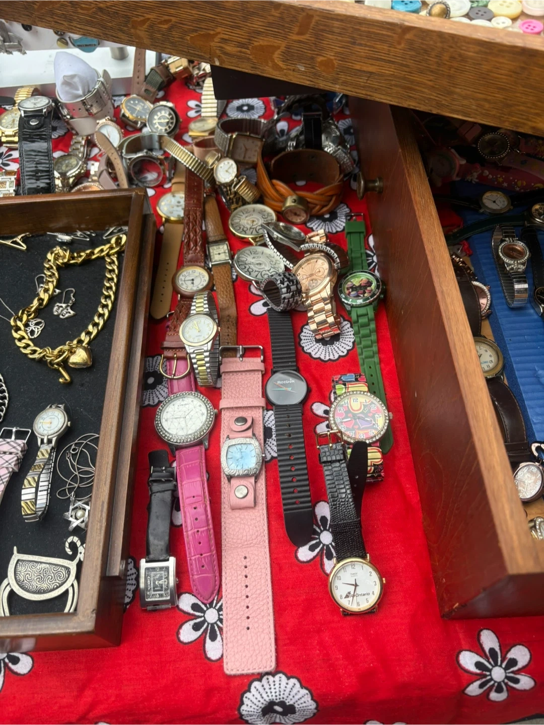 A big estate yard sale (former vintage &antique shop that closed over 11 years ago Too much stuff to mention - lots of Art , A collection of various items including purses, belts in different styles and materials, for men and women including leather and snakeskin. There's also over 100 Retro t-shirts in many sizes a display case appears to be filled with decorative items Watches rings and tools and more Prices from $5.00 to 75.00 Parkside Drive by 417-421 Parkside - late start at 10am till 2pm only Saturday October 4