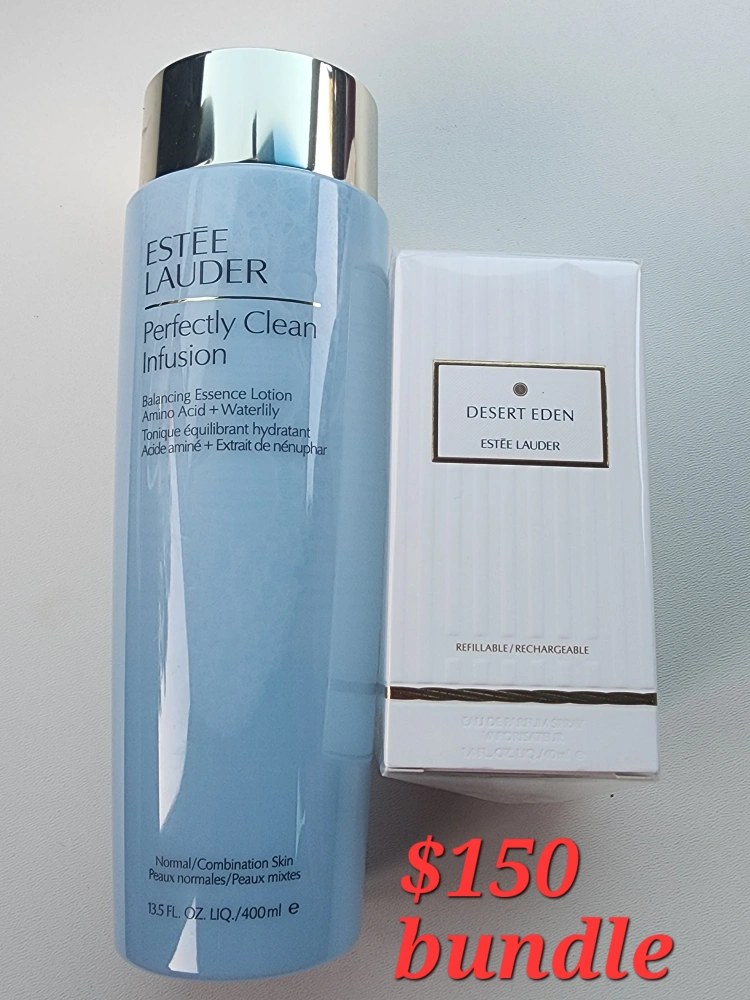 10Selling a bundle of Estee Lauder skincare products! Included is a bottle of Perfectly Clean Infusion Balancing Essence Lotion (400ml) for normal/combination skin, and a Desert Eden refillable/rechargeable item