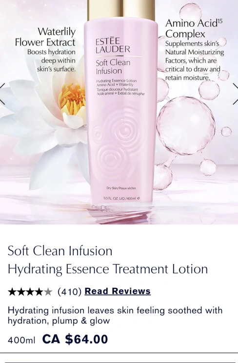 1000+- Brand new bottle of Estee Lauder Soft Clean Infusion Hydrating Essence Lotion. - Full-size 400ml bottle leaves skin feeling soothed with hydration, plump and glowing. - Retails for $64+ tax *If the post is Active, it’s Available* Price is firm. Size as noted on package. --> See DT location below for meet-up, walking distance from Rogers centre.
