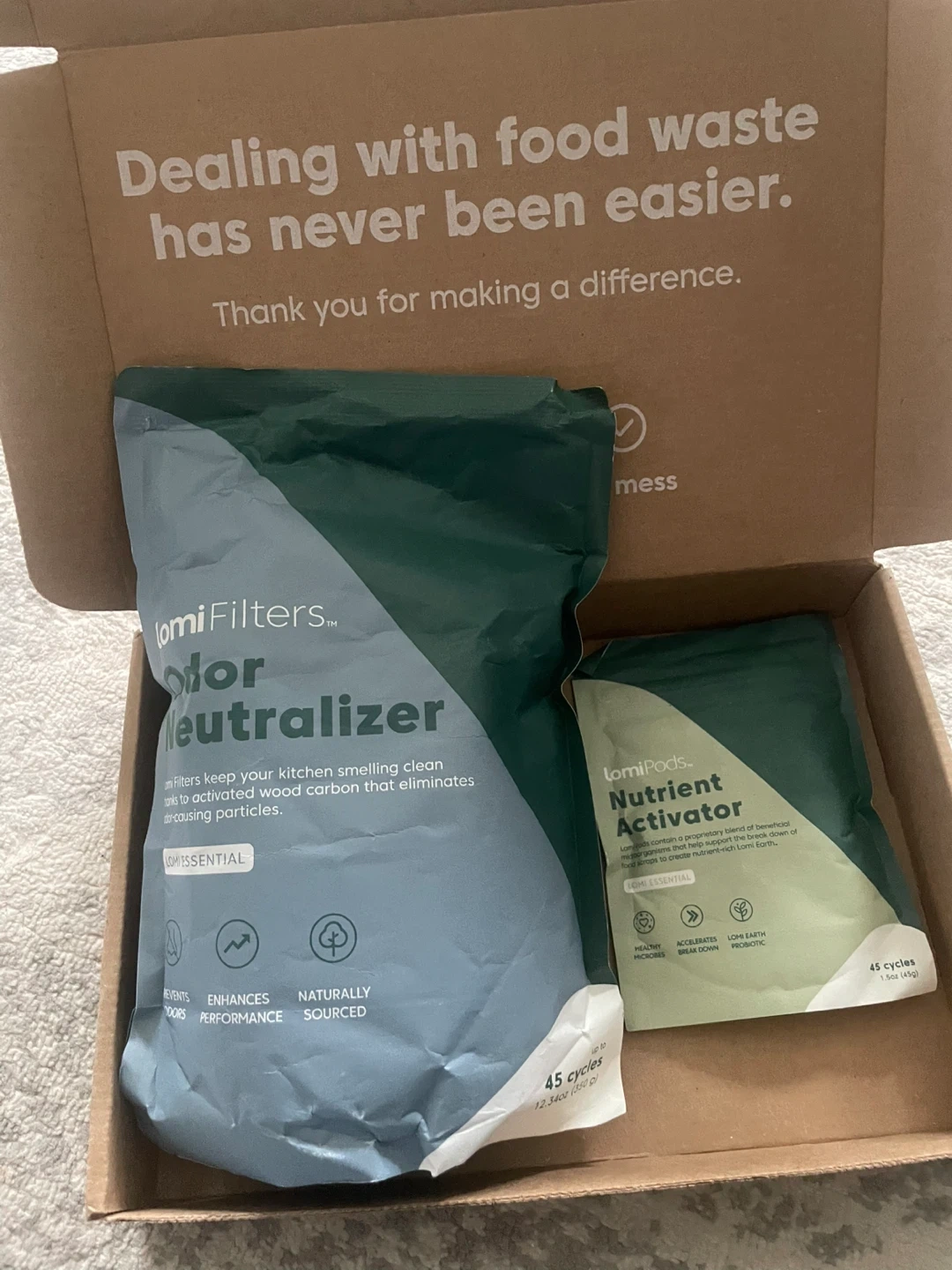 This Lomi kit includes an Odor Neutralizer and a Nutrient Activator. The Odor Neutralizer works to eliminate kitchen smells with activated carbon. The Nutrient Activator is a proprietary blend of beneficial microbes and minerals to help break down contaminants. Each package contains 45 cycles.