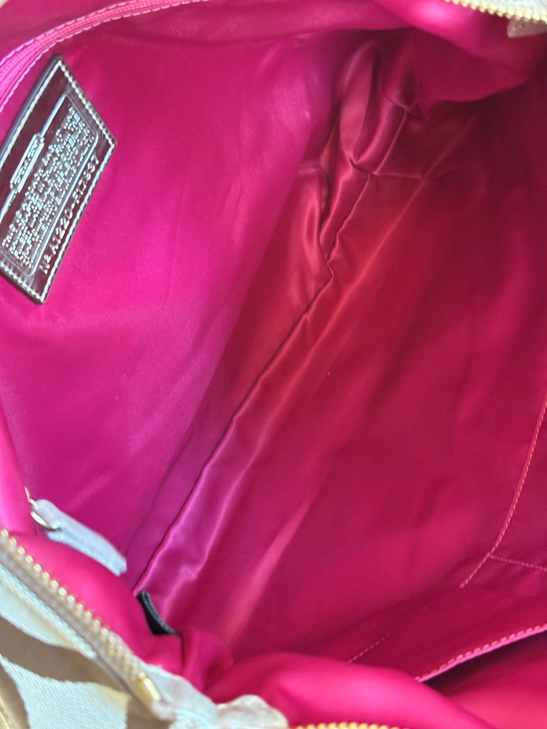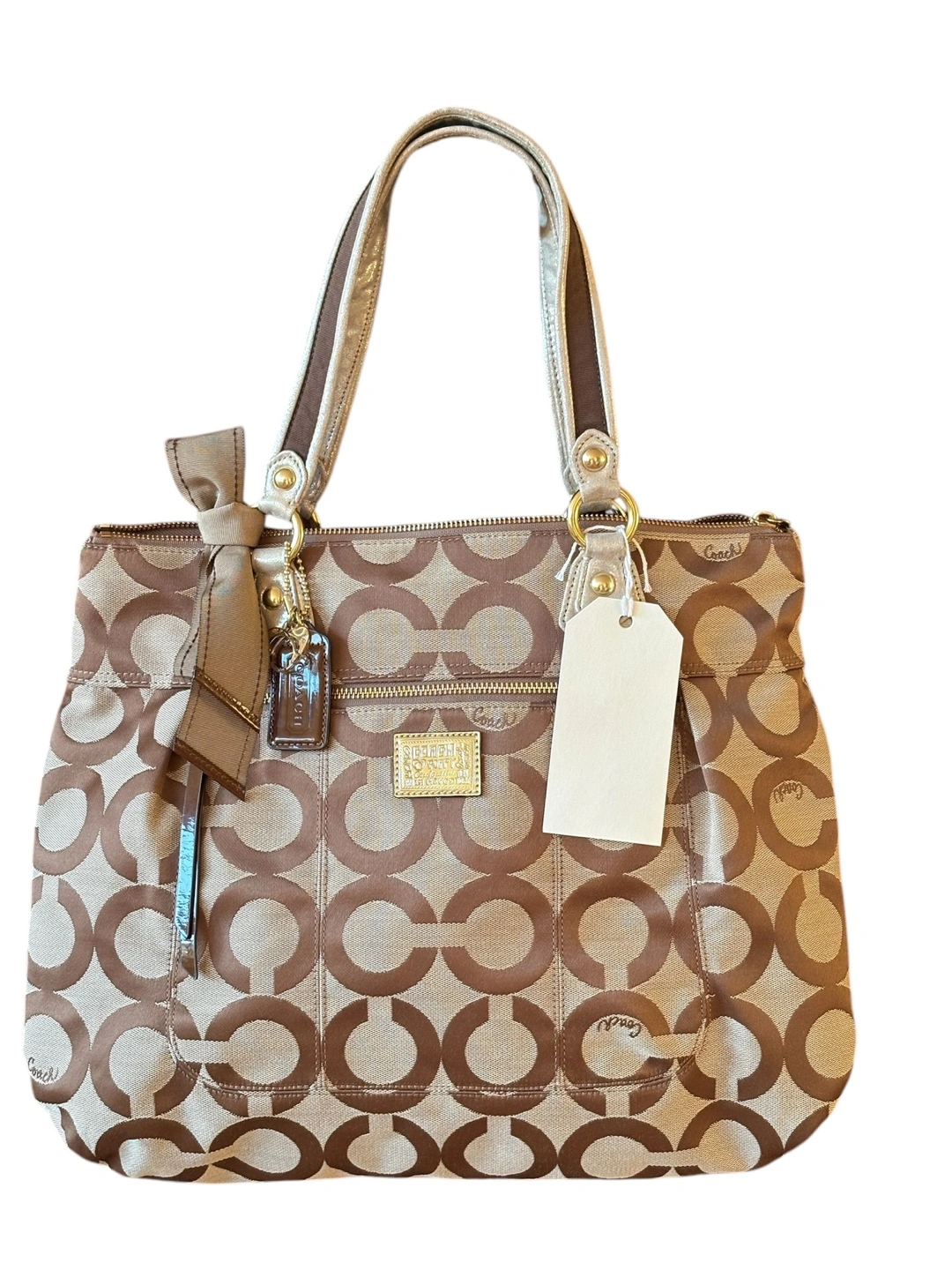 Brand New Coach tote bag. Features a brown and beige signature C pattern. Top zip closure. Two shoulder straps. Interior pockets. Small tag attached.