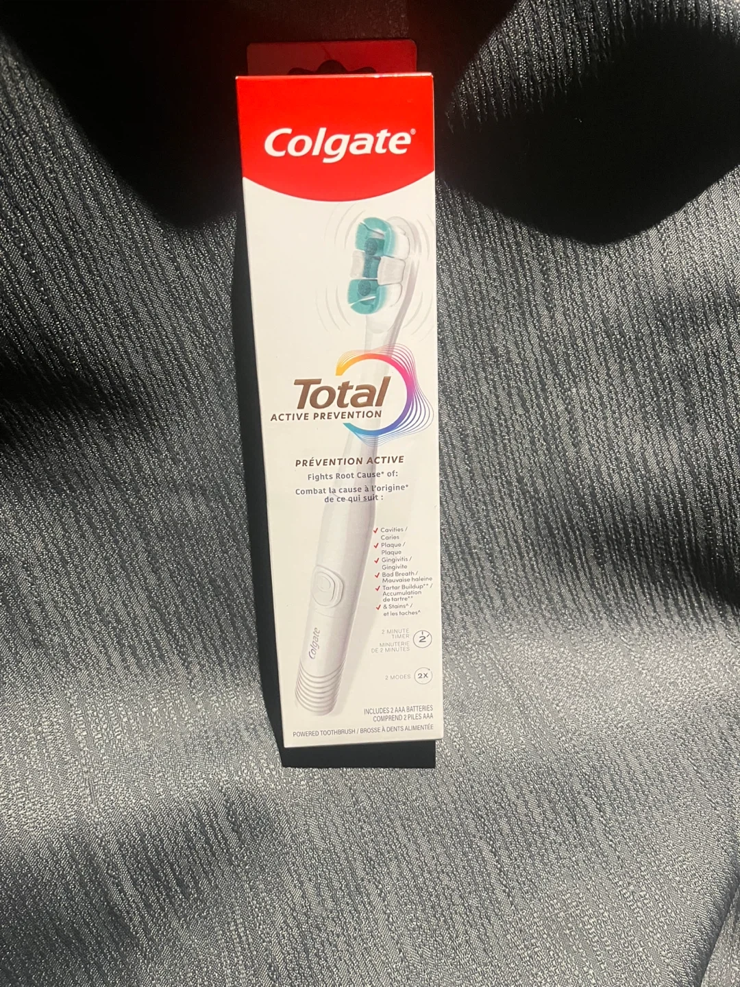 This Colgate Total Active Prevention powered toothbrush is designed for superior cleaning. It fights plaque and gingivitis with high-density bristles for effective cleaning. Includes 2 AAA batteries.