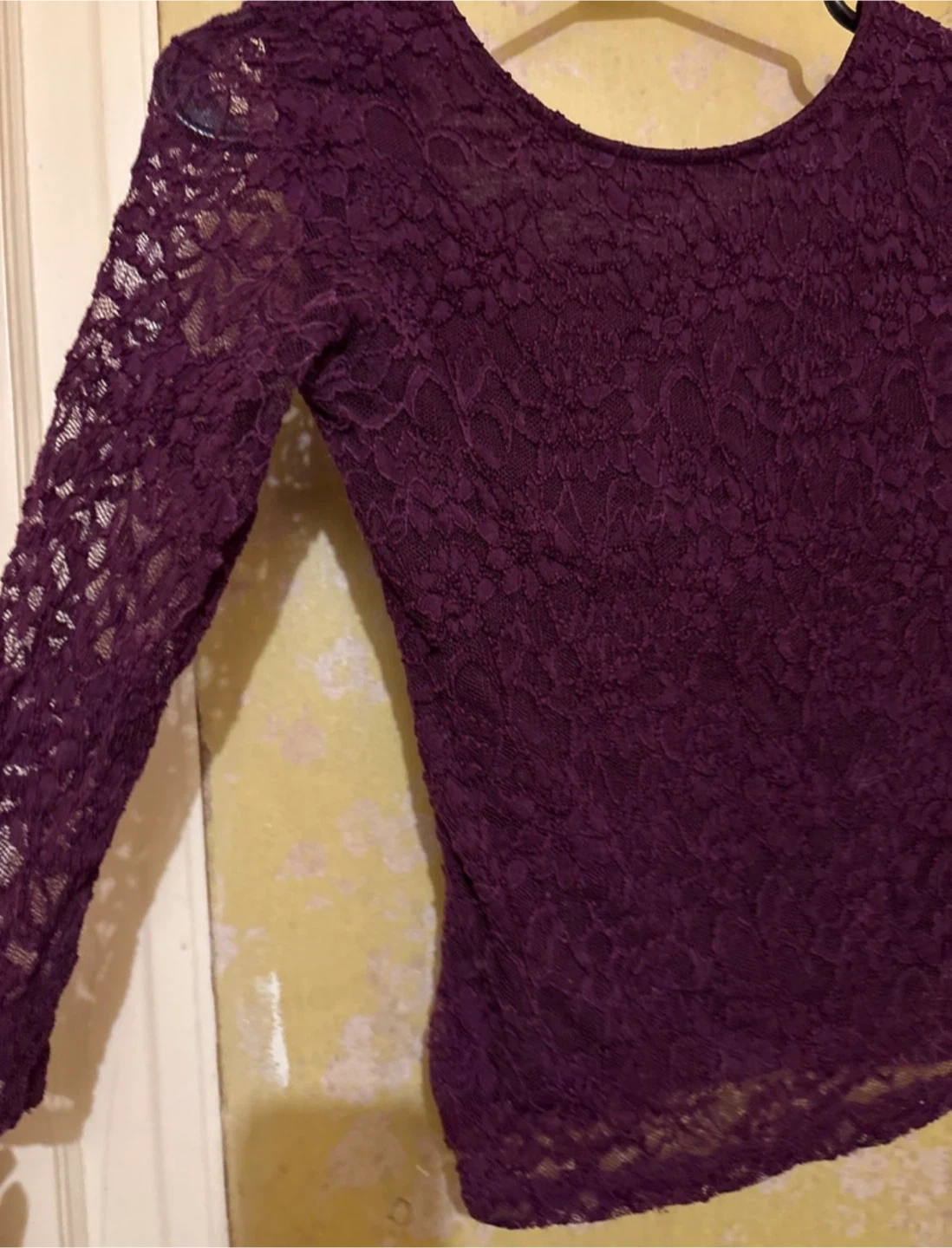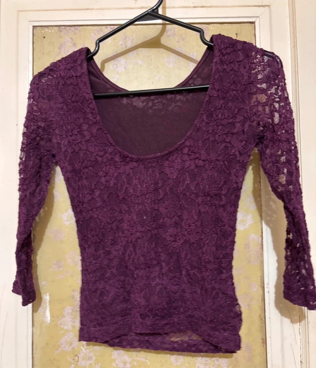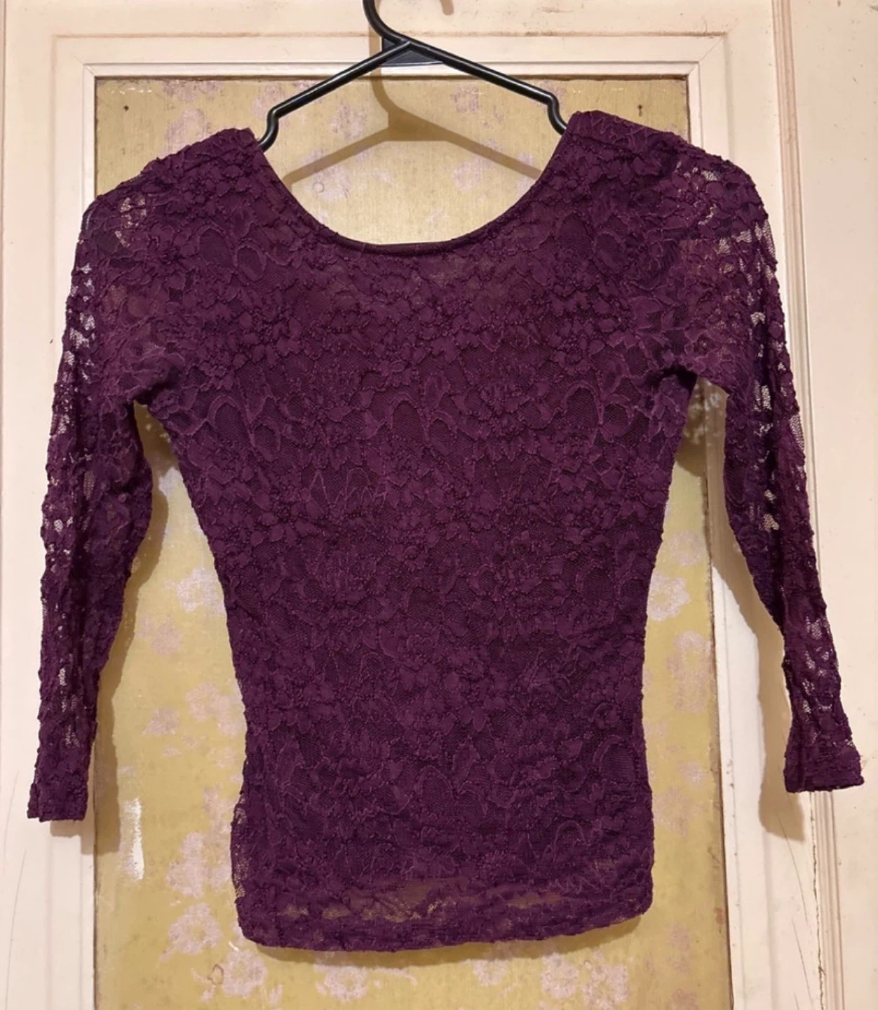 This is a size XS Garage Lace Top. As seen in the photos, it's in good condition. This purple lace top features a flattering scoop neck and 3/4 sleeves, perfect for adding a touch of elegance to any outfit.