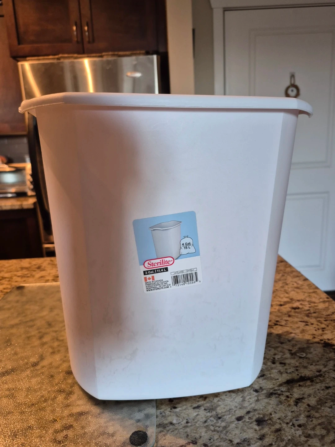 A white Sterilite wastebasket. It holds 4.5 gallons (11.3 L) and is made of plastic. It's a good size for a bedroom or office. Clean & ready for your space.