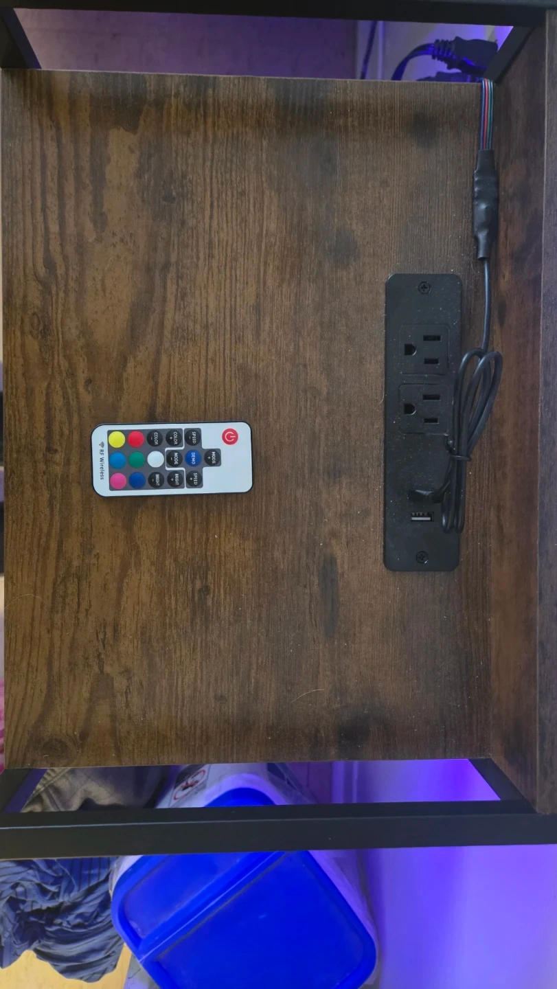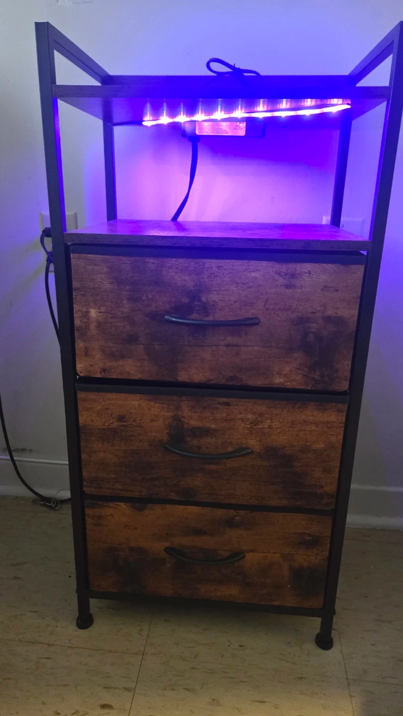 This storage unit features three fabric drawers with wood-look fronts and a metal frame. It's equipped with a power strip that includes two outlets and a USB port. The top shelf has integrated LED lights that are controlled by a remote. It's a handy piece for organizing essentials. Need gone I don't have the space for it message me if you interested about it PICK UP ONLY