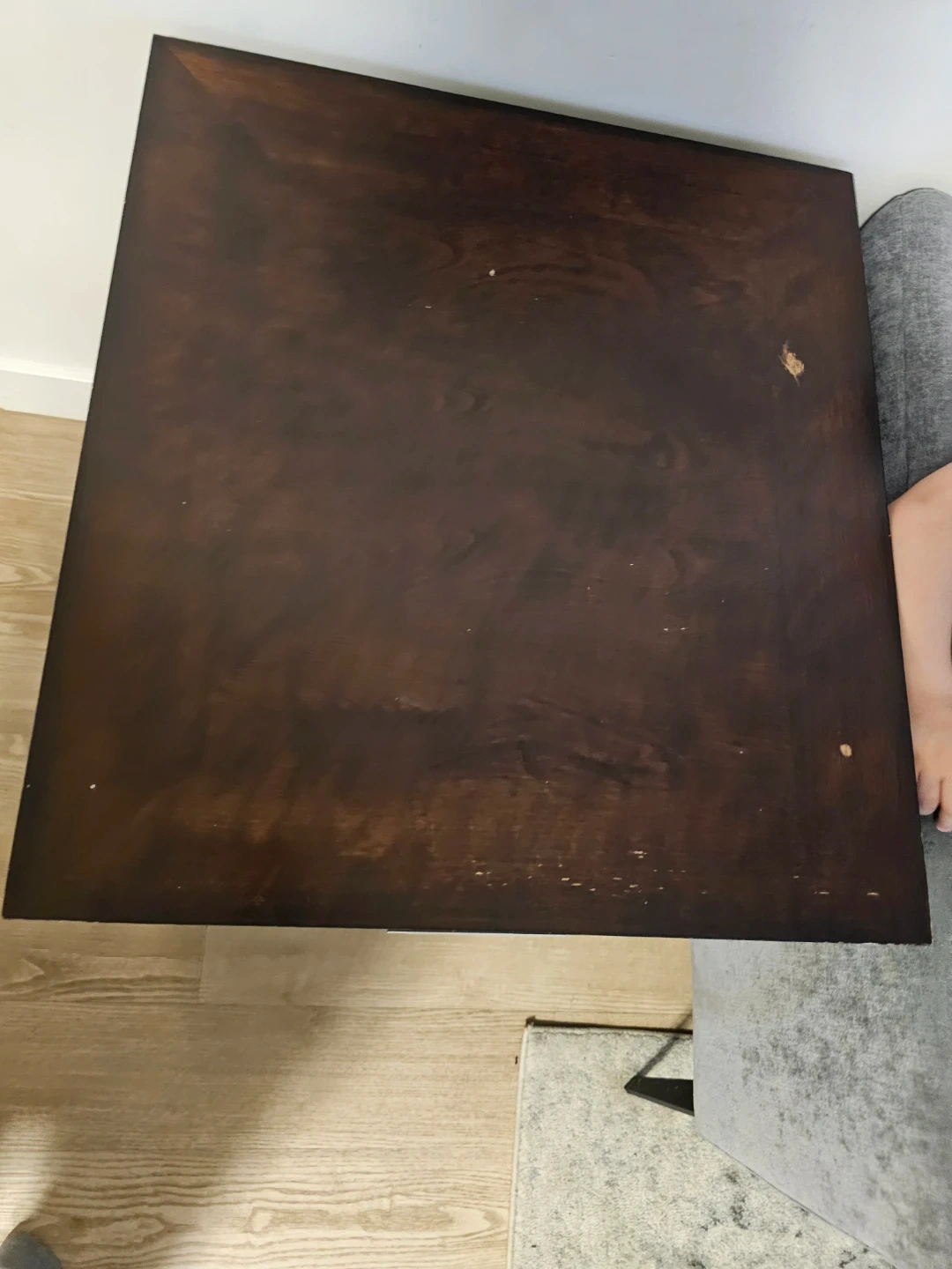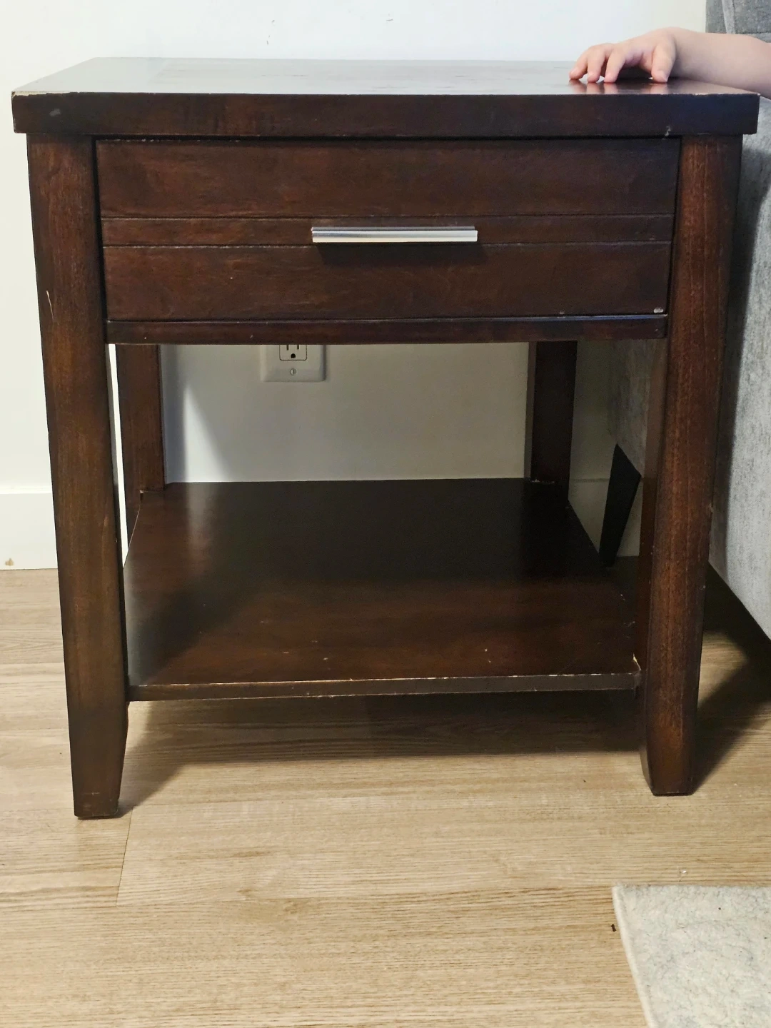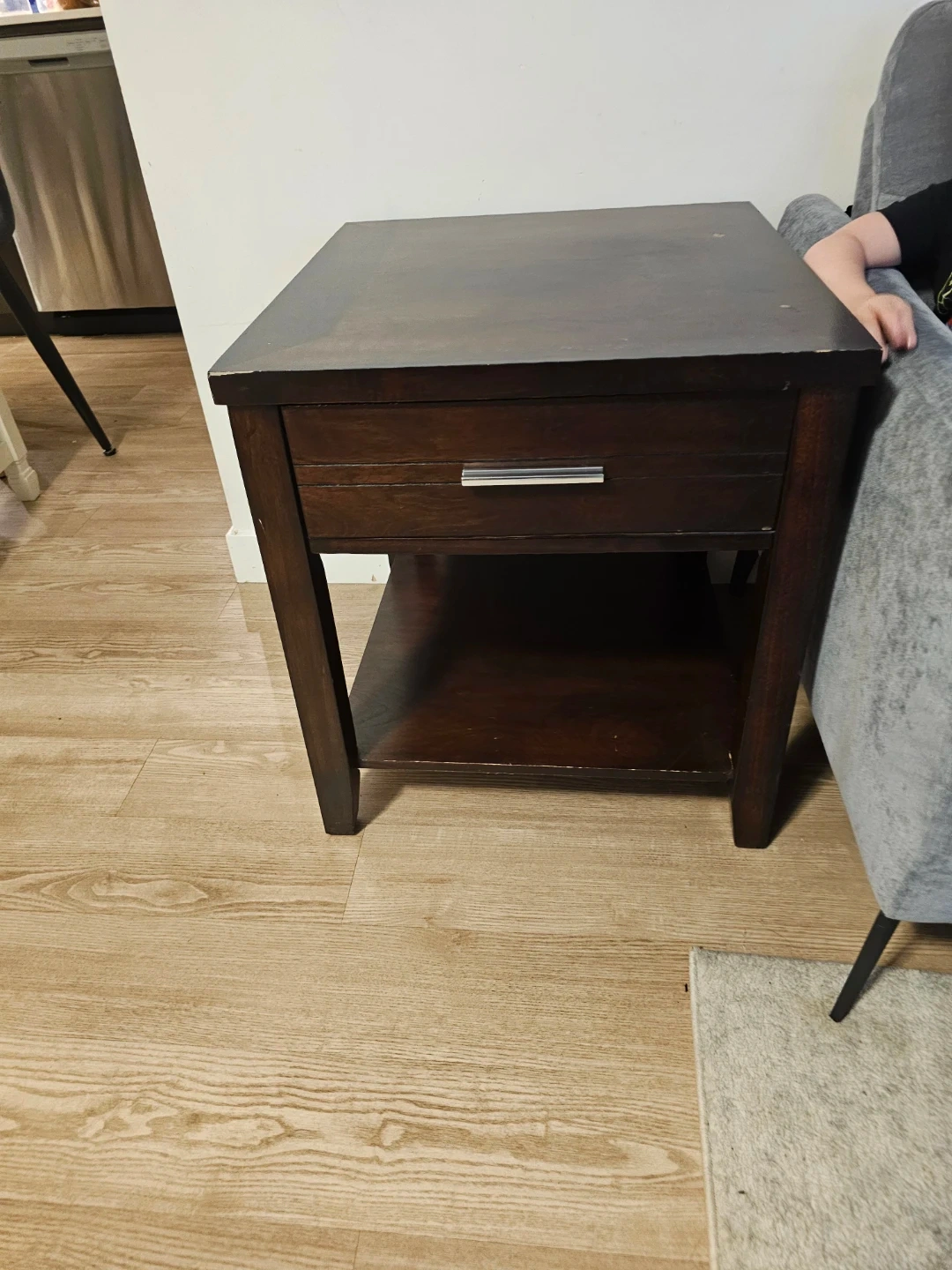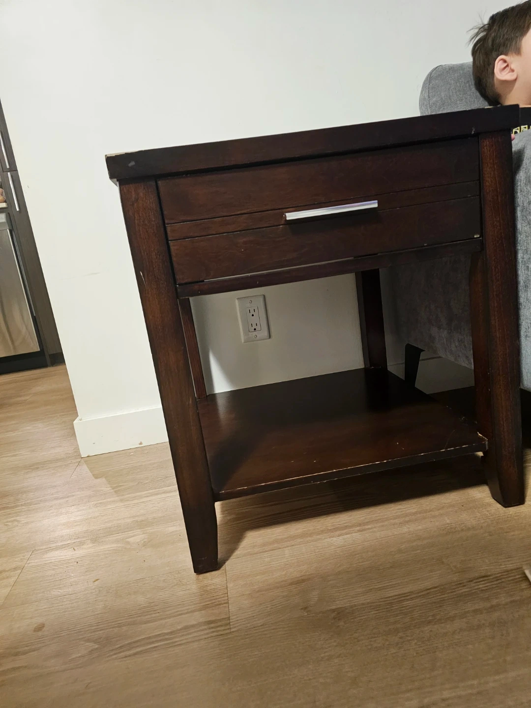 Selling a dark brown wood end table. It features a drawer and a lower shelf for extra storage. There are some signs of wear, but it's still sturdy and functional. Perfect for a bedside table or living room accent!
