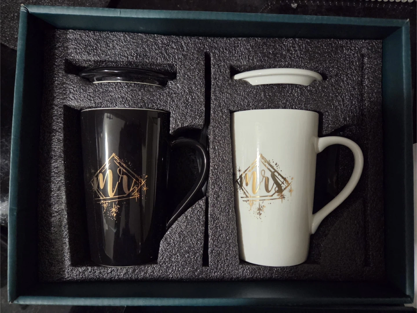 Selling a brand new Mr. & Mrs. mug set! These mugs come in a lovely box, perfect for a wedding or anniversary gift. One mug is black with 'Mr.' in gold lettering, and the other is white with 'Mrs.' in gold lettering. They're a beautiful addition to any couple's collection!