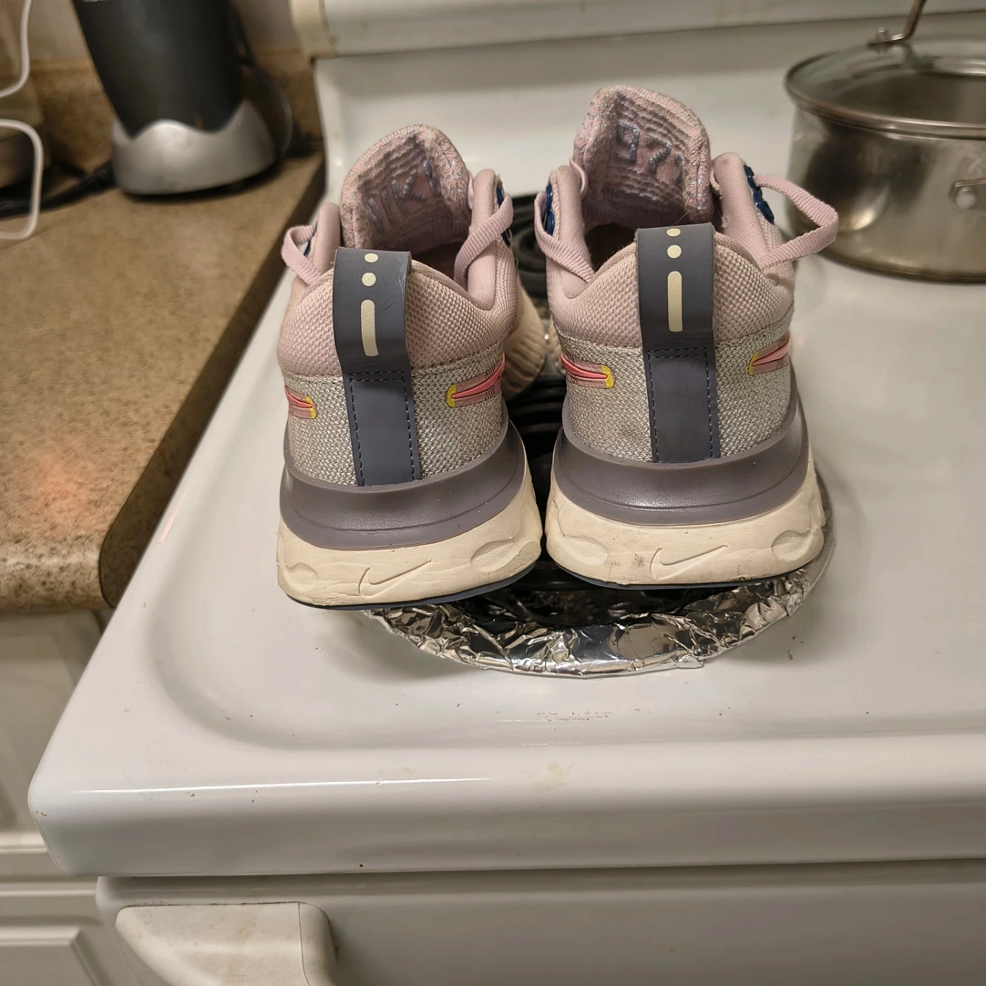 These Nike running shoes feature a light pink and grey knit upper with pink and orange accents. They're built with Nike React technology for a smooth ride. The pull tabs at the heel and tongue make them easy to slip on. These are women's size 7