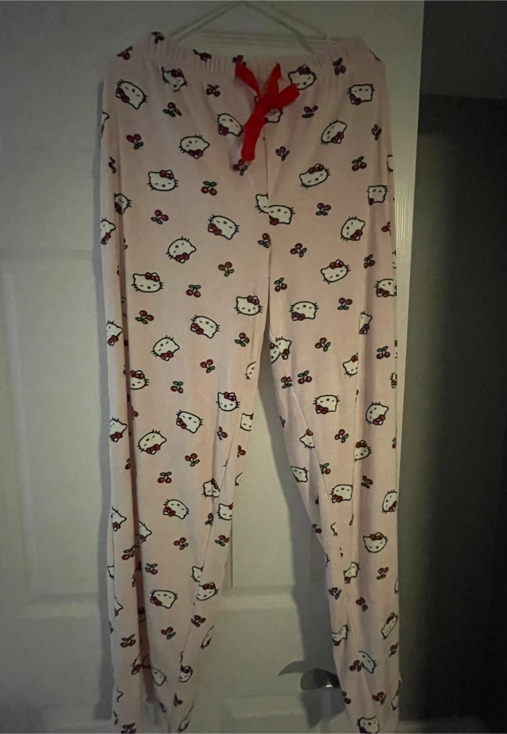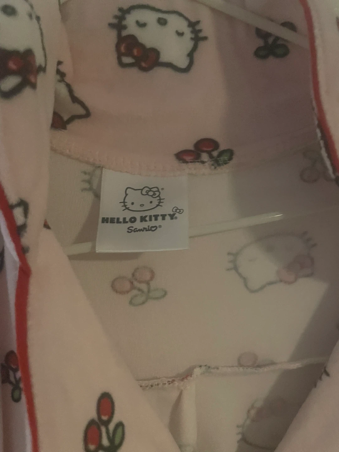 This is a two-piece Hello Kitty pajama set. It includes a button-up top and pants. Both pieces are pink with a pattern of Hello Kitty faces and cherries. The size is M/M. The material is soft and cozy. Brand New