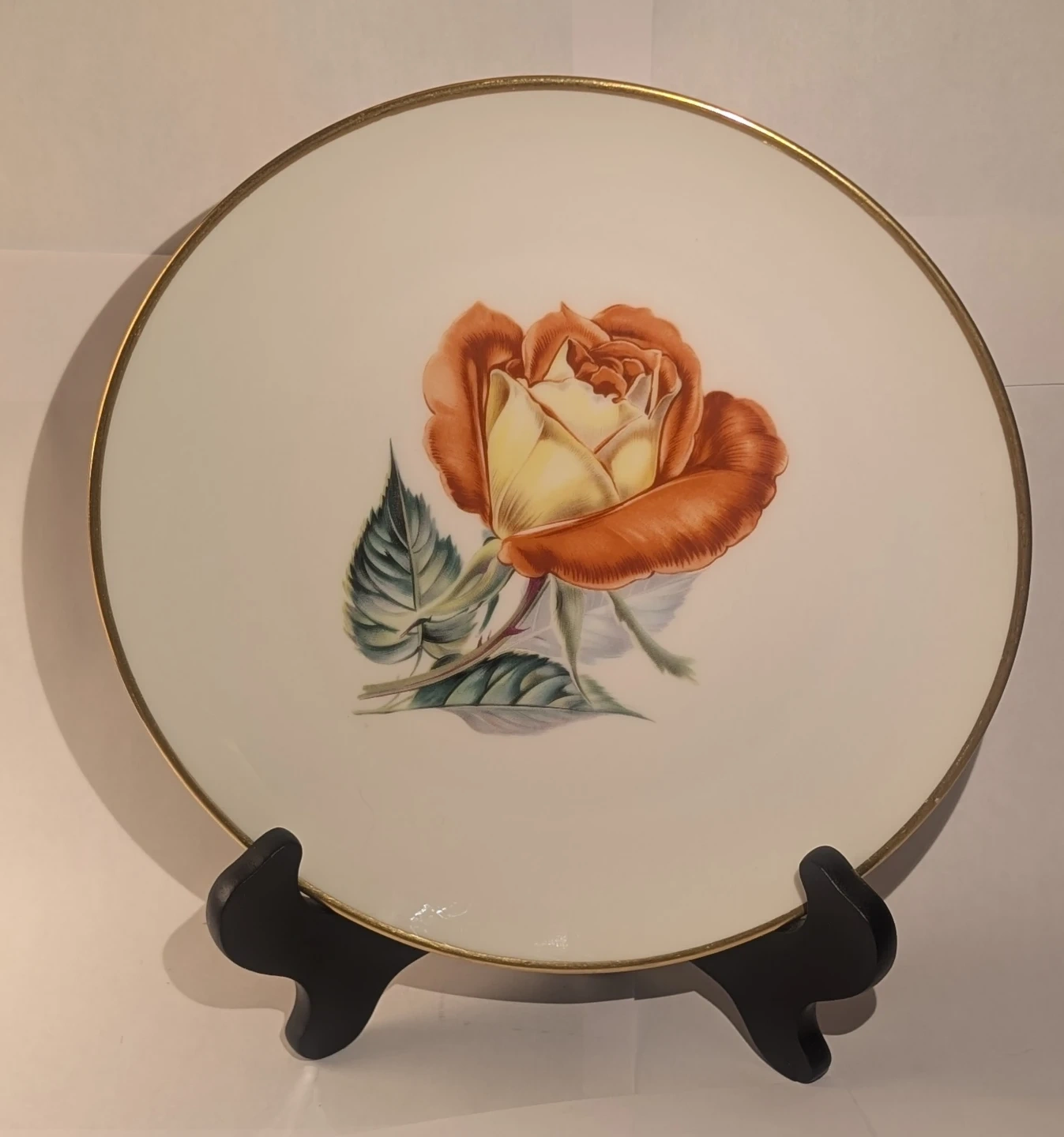Set of three decorative porcelain plates from Heinrich. Each plate features a different rose design: one orange, one pink, and one yellow. Plates have a gold rim and measure approximately 8 inches in diameter. They're perfect for display or adding a touch of elegance to your home. Porcelain material.