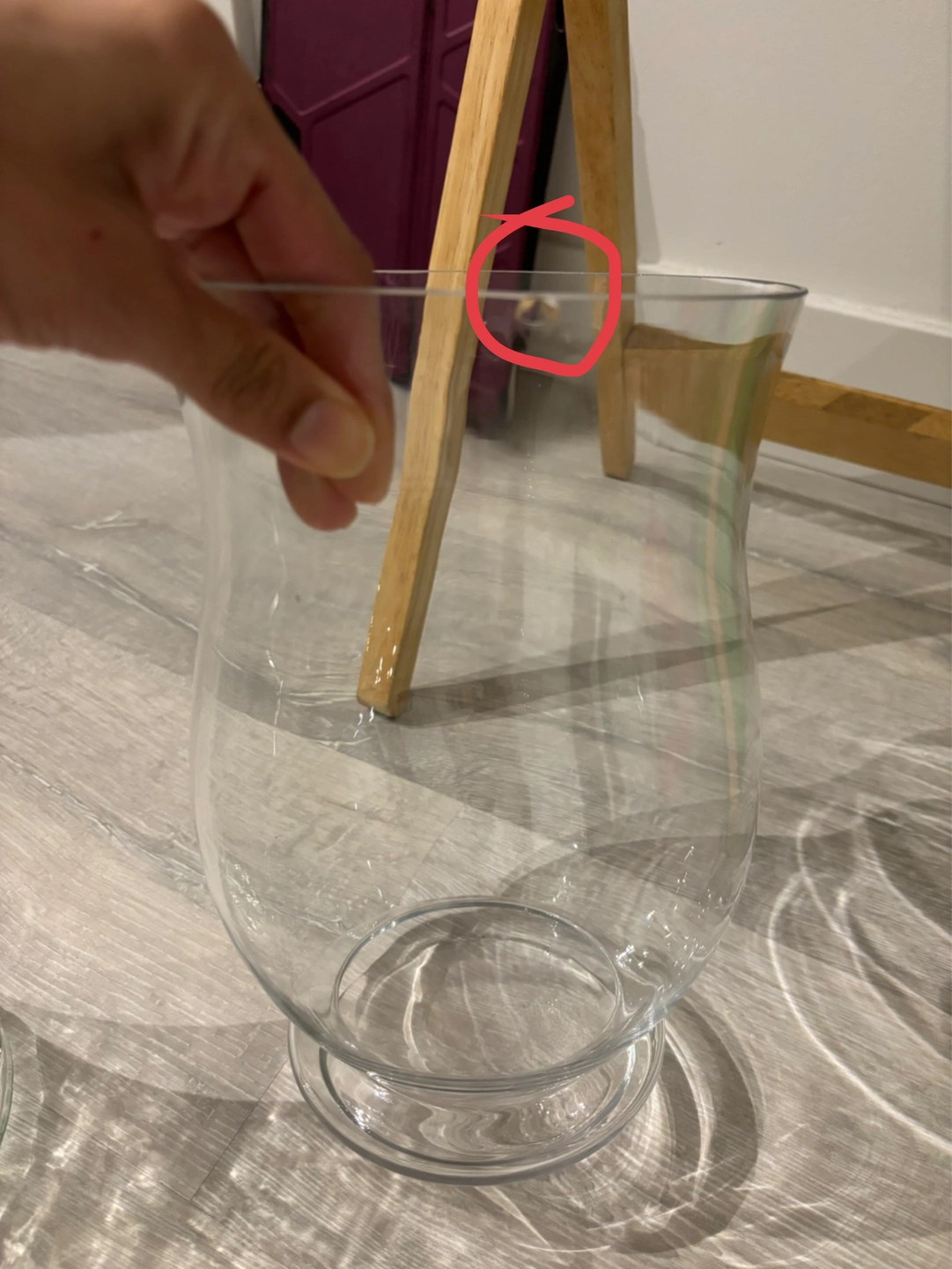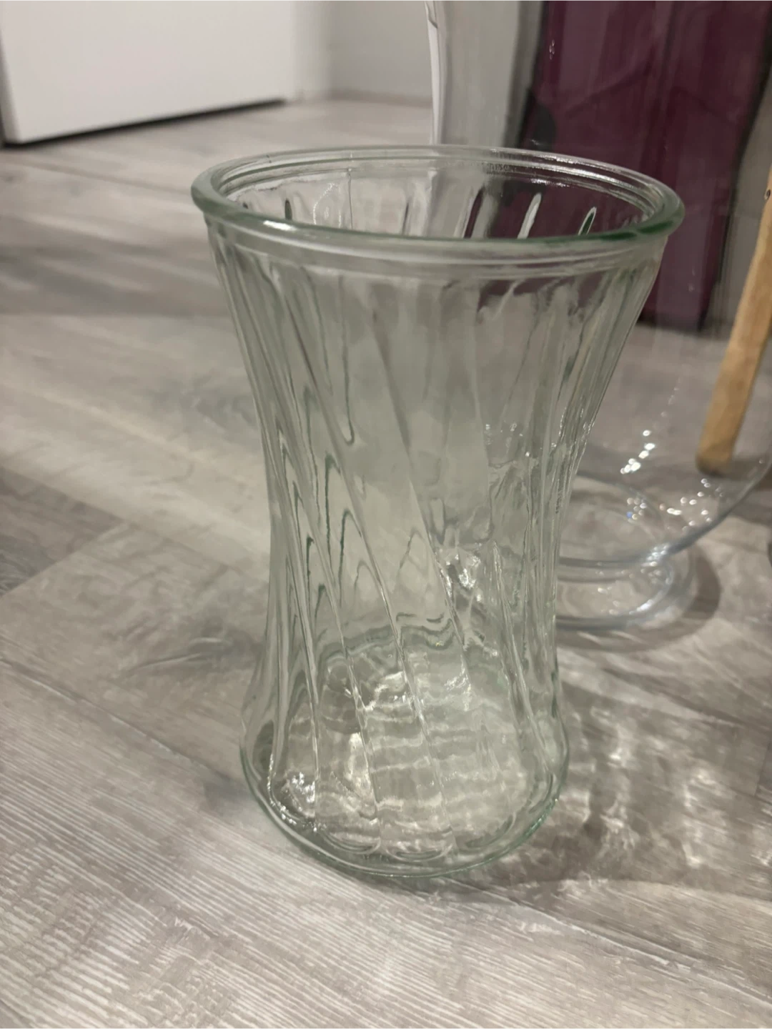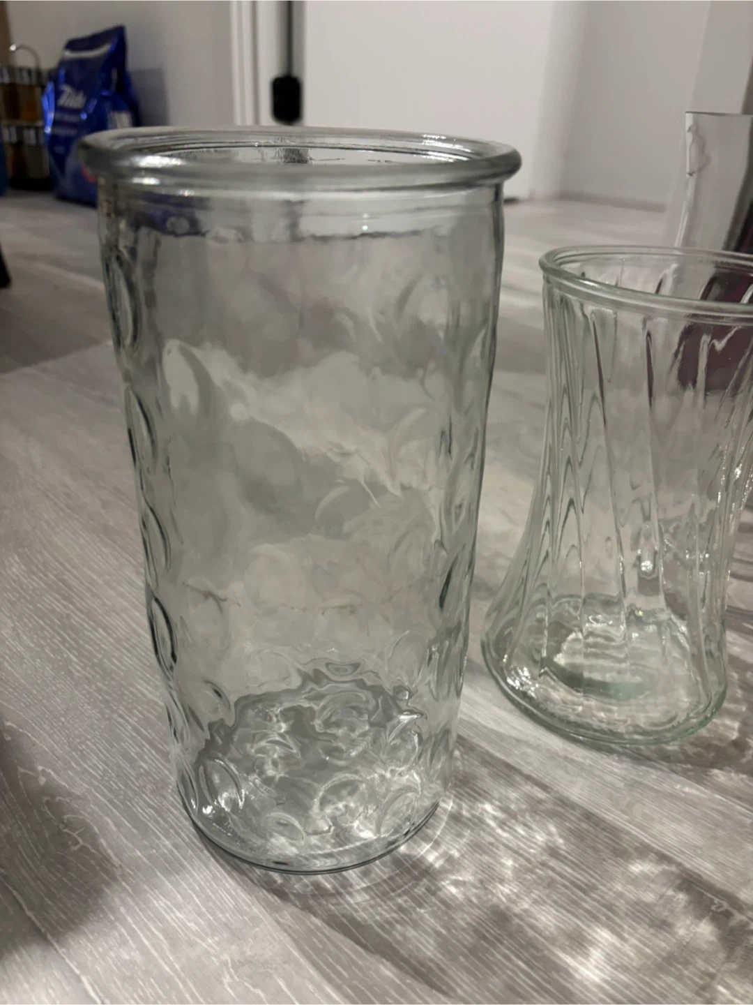 This set includes three clear glass vases. One vase has a twisted design, another has a dimpled pattern, and the third is a classic hurricane shape. Glass material.