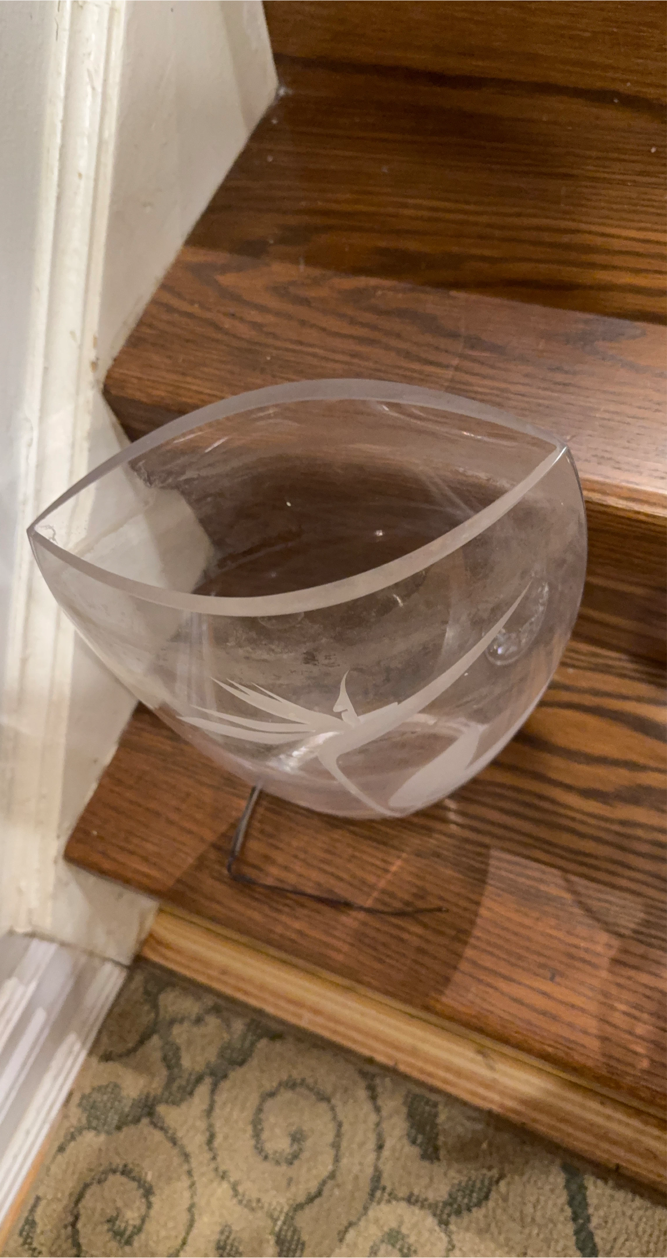 Selling a clear glass bowl with an etched design. It's in great shape and would look lovely as a decorative piece