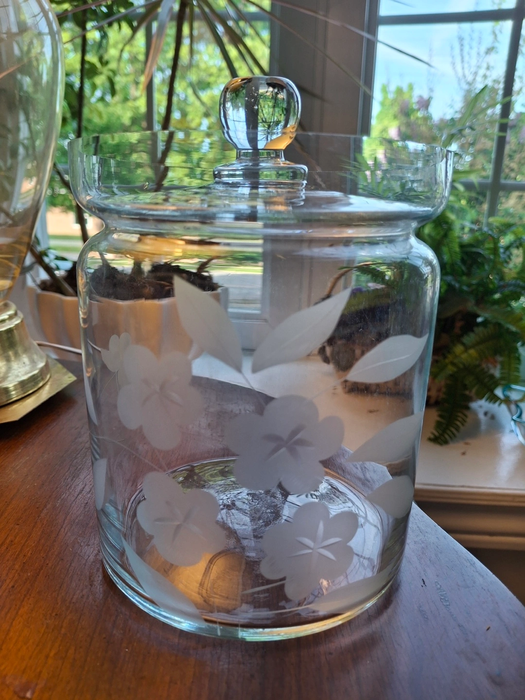 1000+Clear glass jar with etched floral design. Features a glass lid with a knob. Lightweight/fine glass. Very good condition, no chips. 8” tall x 5” wide. Available for pickup in Markland Wood.